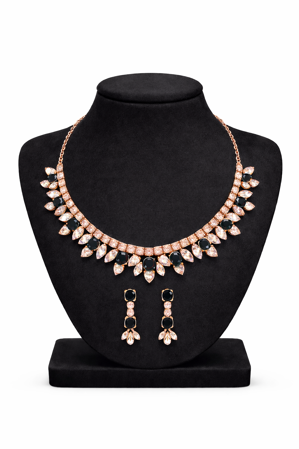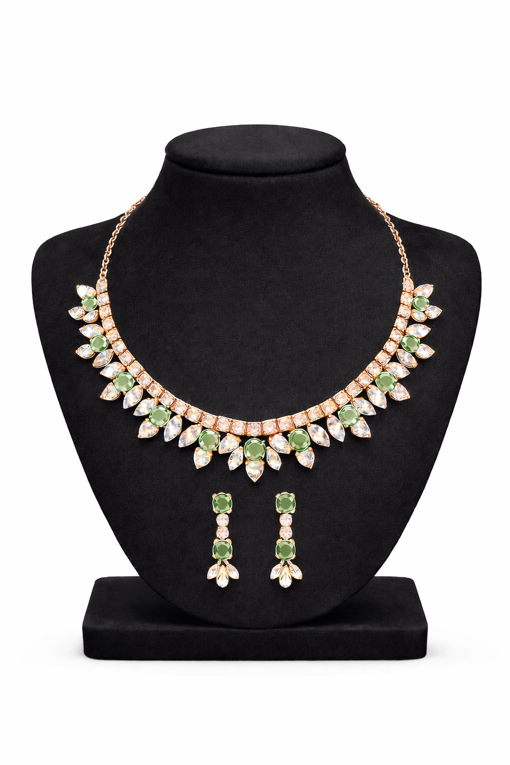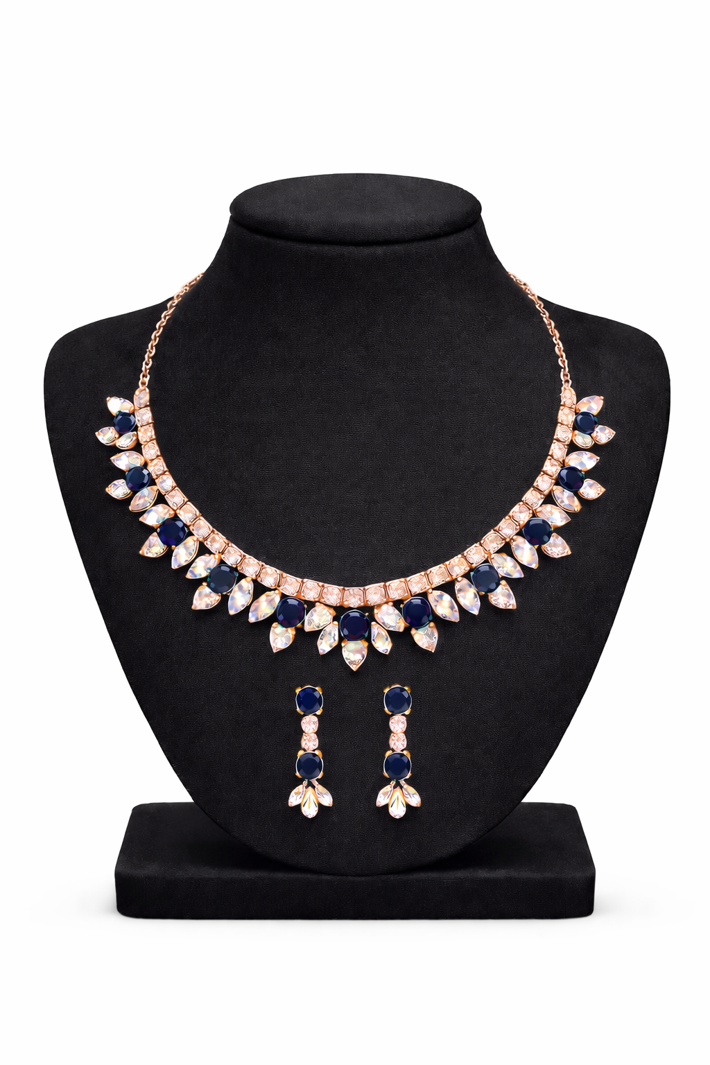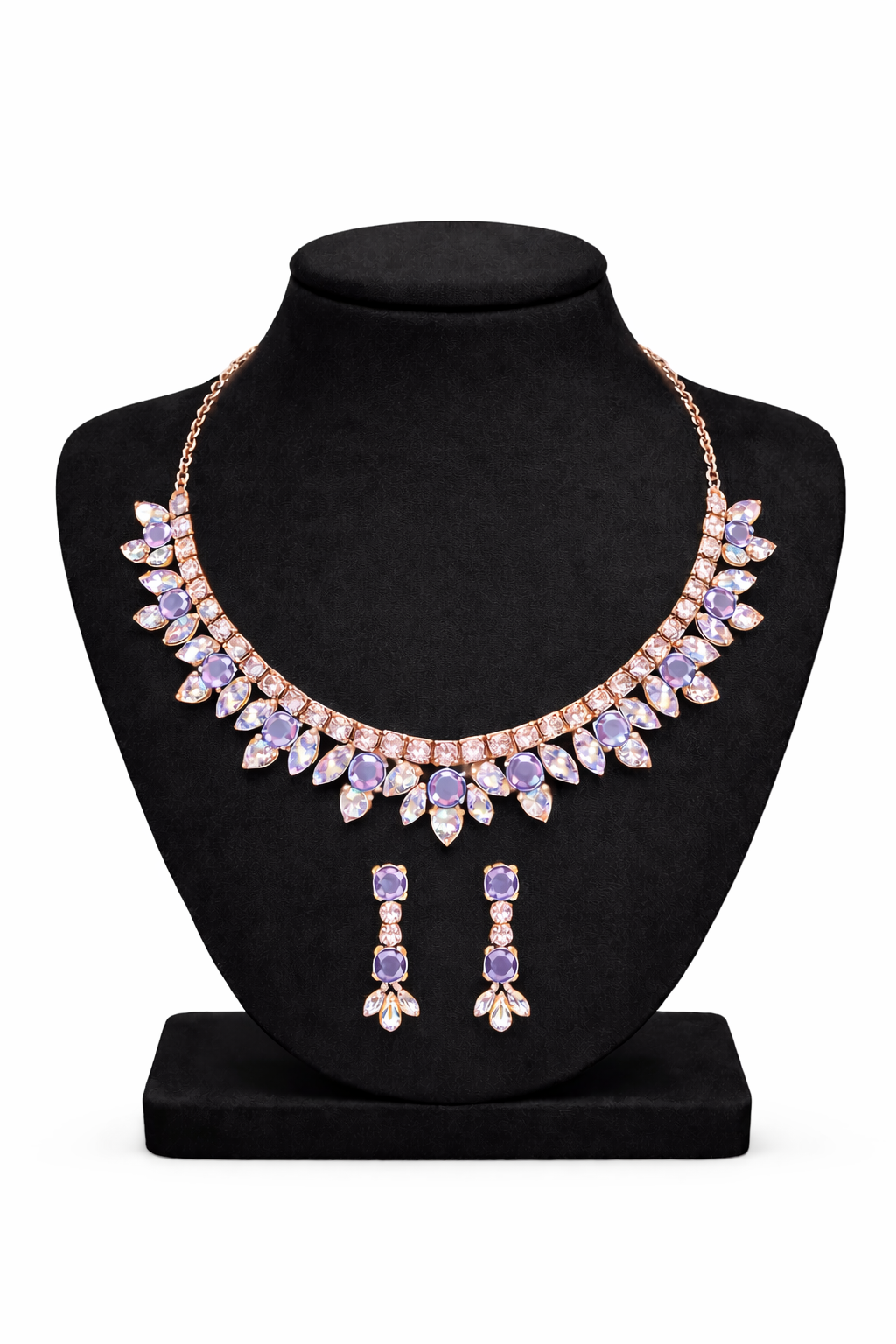 This elegant necklace set features a beautifully crafted floral design adorned with shimmering white stones. The necklace is gracefully arranged with oval and marquise-cut stones, creating a refined sparkle that sits perfectly on the neckline. Paired with matching drop earrings, this set offers a timeless and sophisticated look.