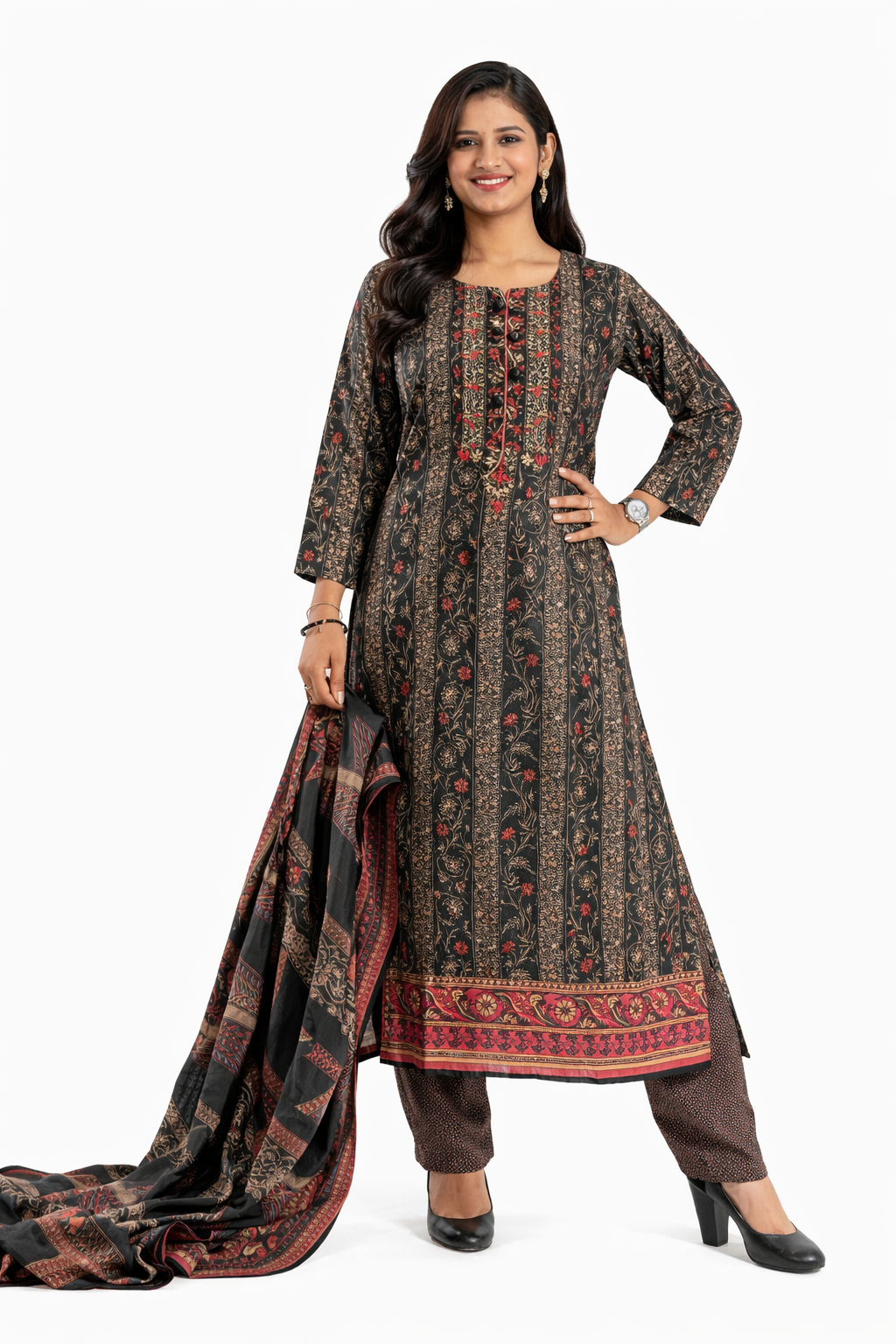 Make a bold and elegant statement with this beautifully crafted black printed suit set. Designed in a flattering Anarkali-style silhouette, this outfit combines traditional motifs with a contemporary edge.