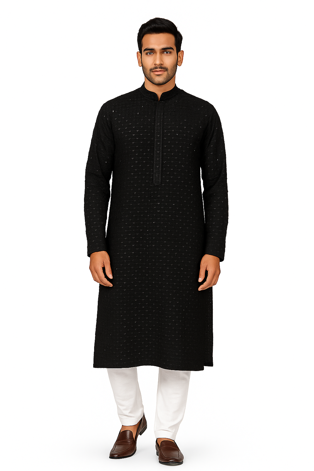 Step into refined elegance with this Men’s Black Sequin Long Kurta Set, perfect for festive celebrations and formal occasions. Expertly tailored from rich, breathable fabric, this kurta features a subtle self-textured design enhanced with delicate sequin embroidery that adds a sophisticated shimmer without being overpowering.