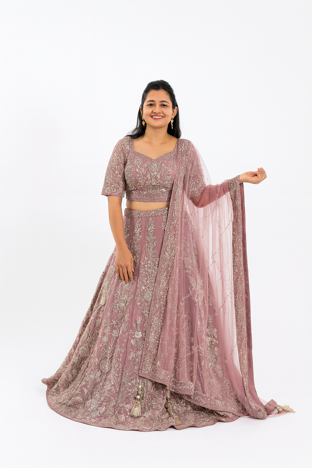 The heavy lehenga suit is often made from rich and luxurious fabrics such as silk, velvet, or brocade, which provide a regal and majestic appearance. The stones are intricately placed on the fabric, creating beautiful patterns, motifs, or borders. The stone works can be concentrated on specific areas of the lehenga, such as the waistline, hemline, or throughout the fabric, depending on the design.