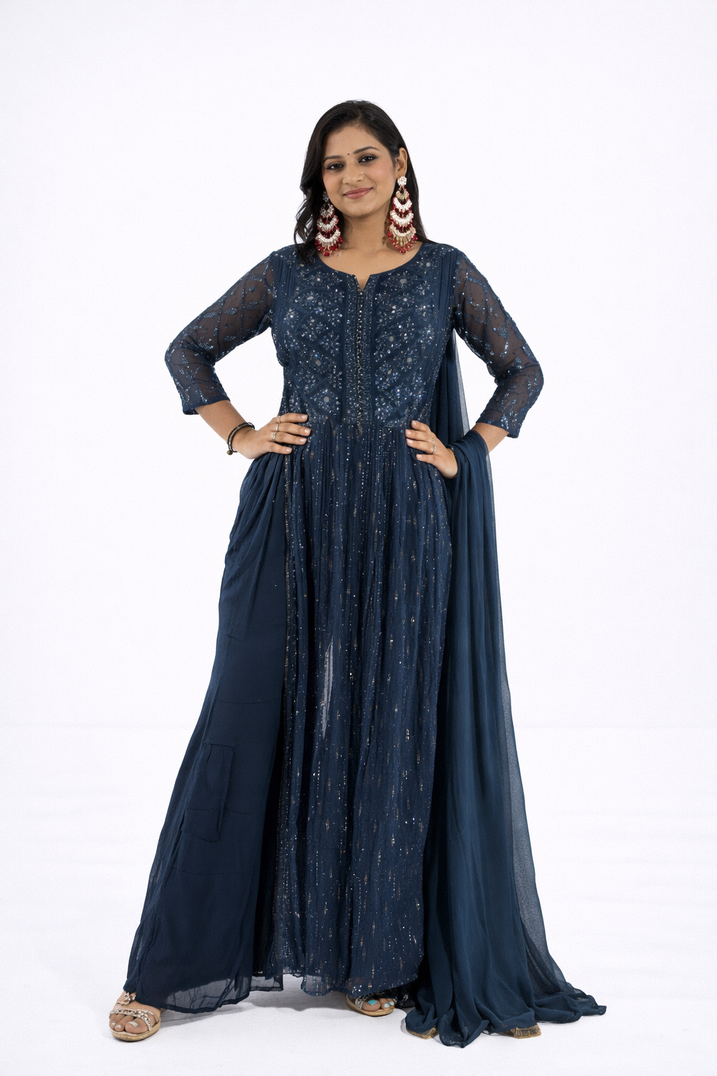 To complete the ensemble, a dupatta is included. The dupatta is made from georgette fabric and can be embellished with matching embroidery or prints to complement the kurta. It can be draped over the shoulders or around the neck, adding an extra layer of elegance and style to the overall look.