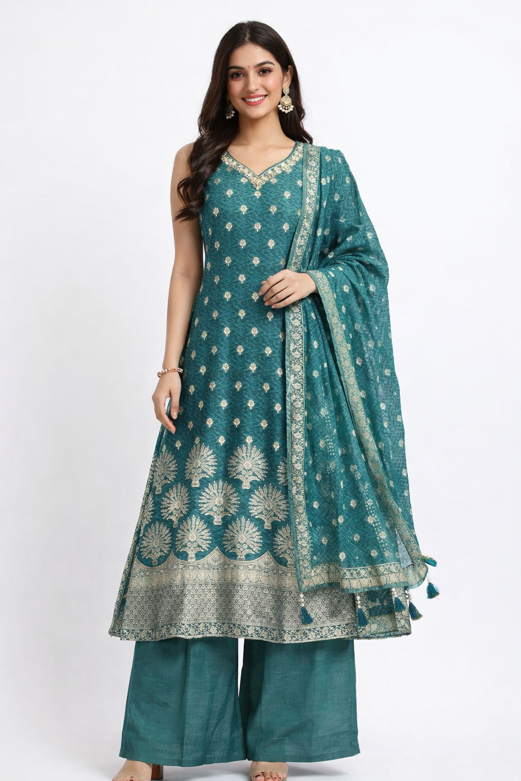 Elevate your ethnic wardrobe with this elegant Anarkali kurta set, crafted in a soothing teal green tone. The Anarkali features delicate all-over motifs with a beautifully detailed floral border at the hem, creating a graceful flare and timeless appeal. The V-neckline is enhanced with subtle embellishment, adding a refined festive touch.Paired with matching wide-leg palazzo pants for comfort and effortless movement, the set is completed with a coordinated dupatta featuring a complementing border and tassel detailing. Perfect for festive occasions, family gatherings, and evening celebrations, this ensemble blends traditional charm with modern elegance.Anarkali Kurta, Palazzo Pants & DupattaKurta & Palazzo – Soft blended fabricDupatta – Lightweight printed fabricFlared Anarkali silhouetteComfortable palazzo pantsElegant festive lookOccasion:Festive wear, casual celebrations, ethnic parties