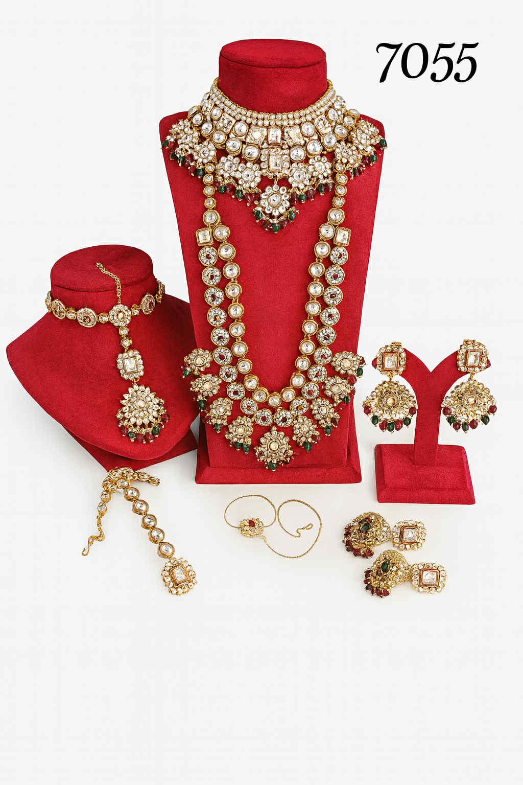 Heavy Choker NecklaceLong Rani Haar NecklacePair of EarringsMaang TikkaHand Bracelet (Haath Phool)Adjustable Waist Belt / ChokerNath (nose ring)This exquisite set is adorned with premium Kundan stones, pearls, and ruby-green beads that highlight every intricate floral motif. The combination of antique gold plating with red and green enamel touches gives it a majestic Mughal-inspired look.Ideal for brides and wedding functions — Sangeet, Mehendi, or Reception — this set enhances lehengas, sarees, and bridal gowns alike.