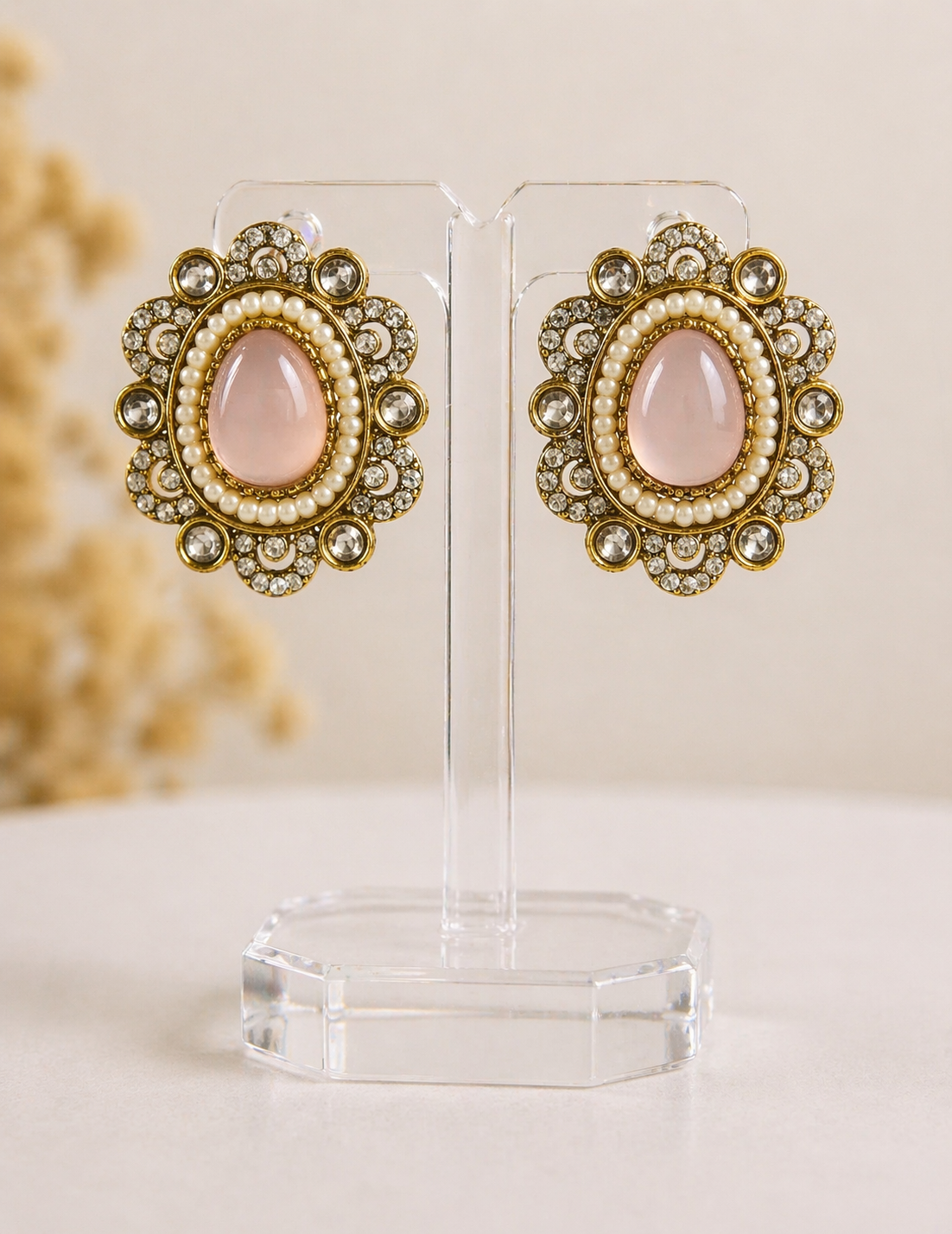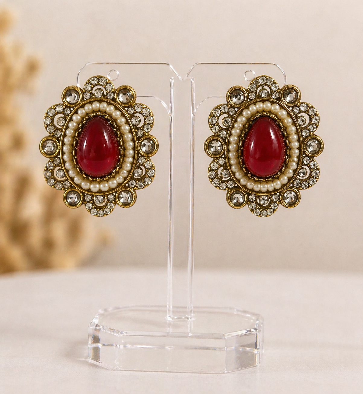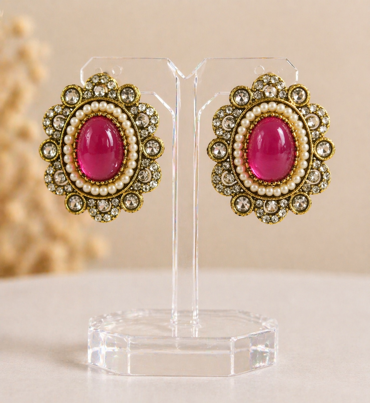 Elegant and timeless, these statement stud earrings are crafted to elevate any ethnic or fusion look. Designed with a rich Rani pink center stone, each piece is beautifully framed with delicate pearl detailing, shimmering crystal embellishments, and an intricate antique gold finish.