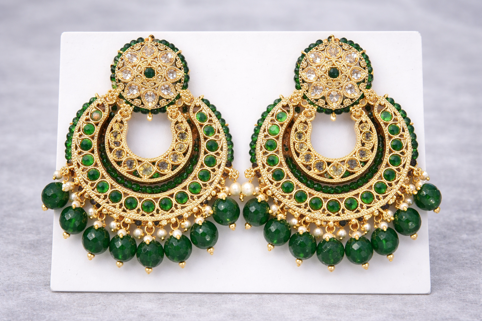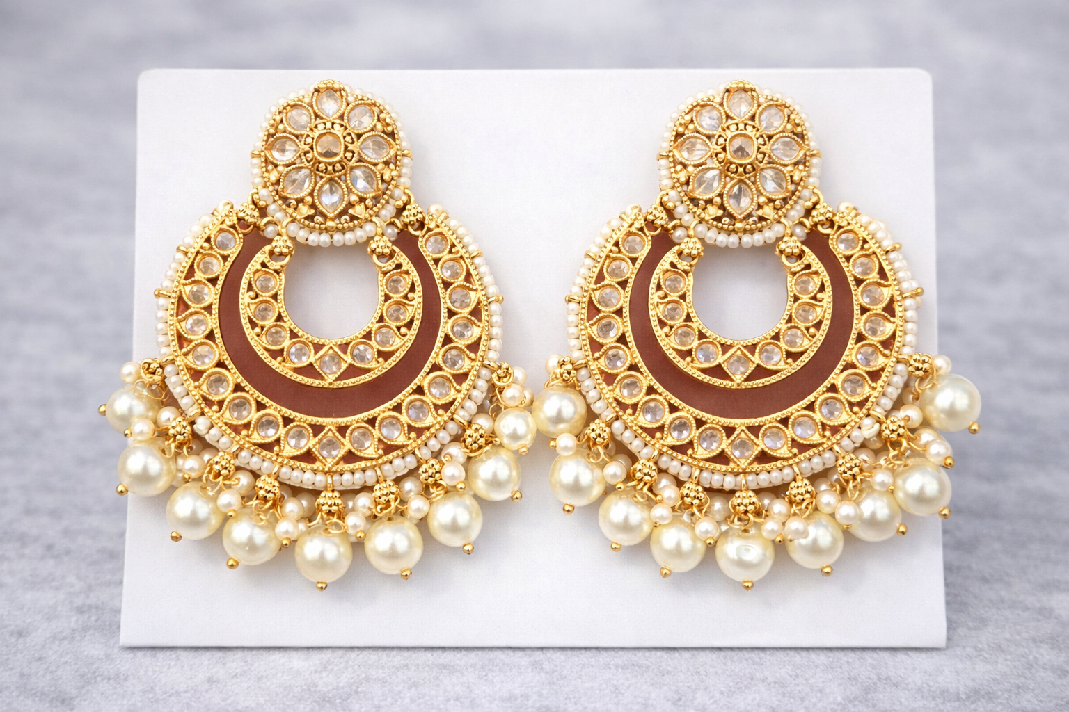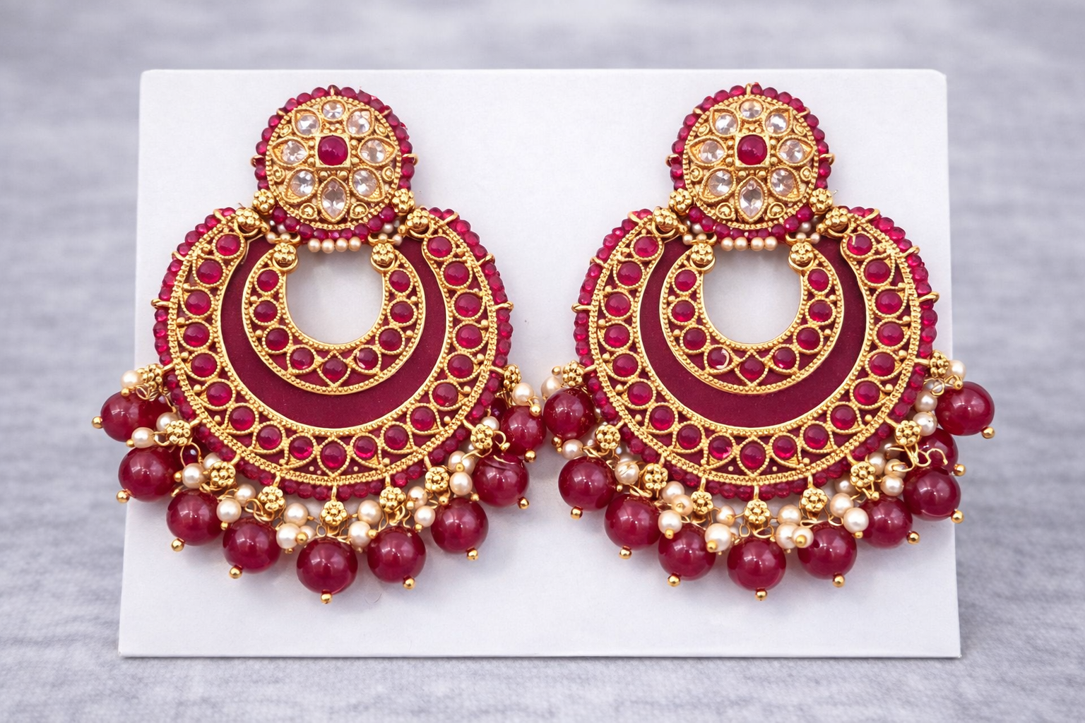 Striking gold-tone crescent earrings featuring rich ruby red stones, clear kundan detailing, and intricate antique-finish craftsmanship. Accented with deep red bead drops and delicate pearl highlights, these earrings offer a bold yet elegant traditional look. Perfect for weddings, festive wear, and special occasions, they pair beautifully with sarees, lehengas, and anarkalis for a regal statement.