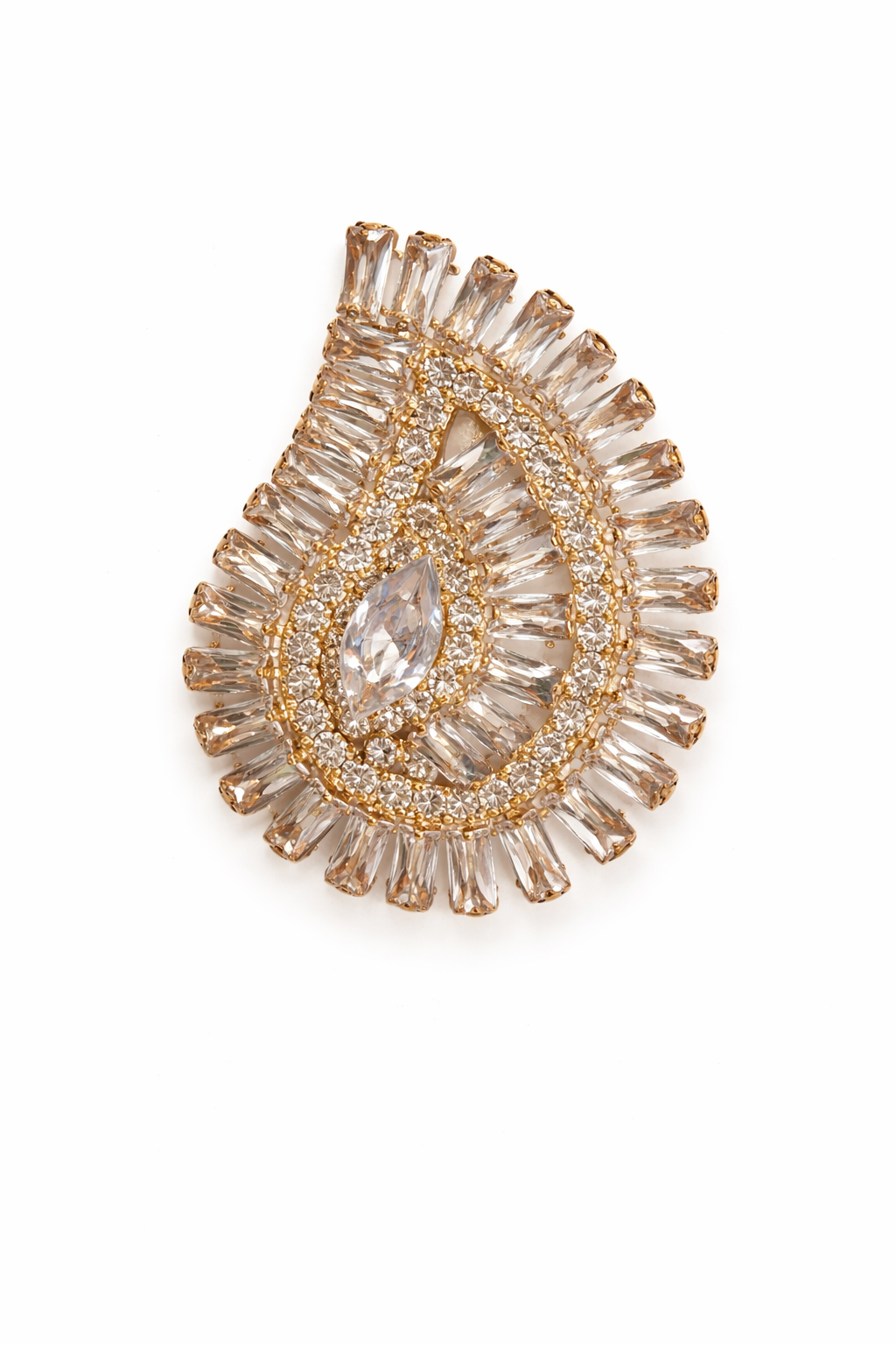 A breathtaking teardrop-shaped brooch designed to add refined sparkle and elegance to any outfit. Crafted in a rich gold-tone finish, this brooch features a striking pear-cut crystal at the center, encircled by finely set round crystals and radiant baguette-cut stones that create a sunburst effect. The layered design delivers exceptional brilliance and a luxurious, premium look.
