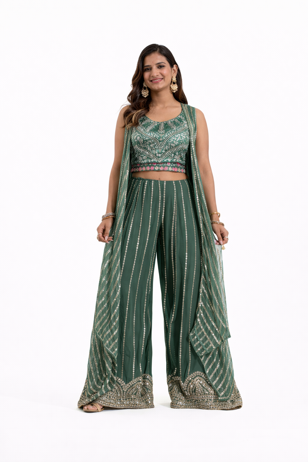 The ensemble consists of three main components: the jacket, the plazo pants, and the short tops.