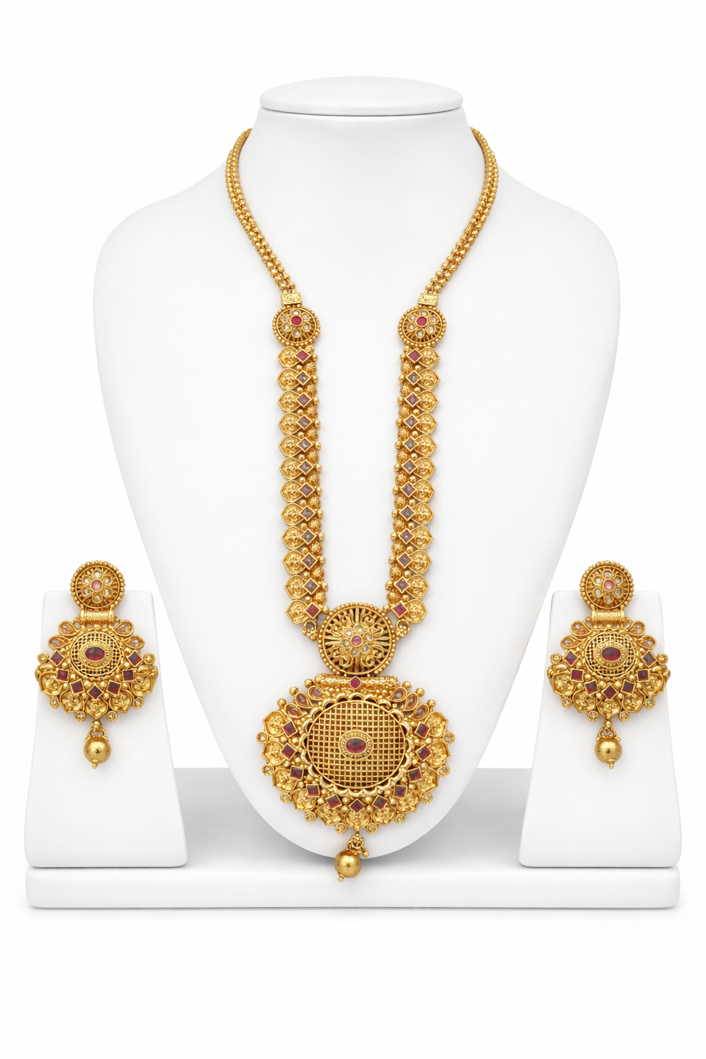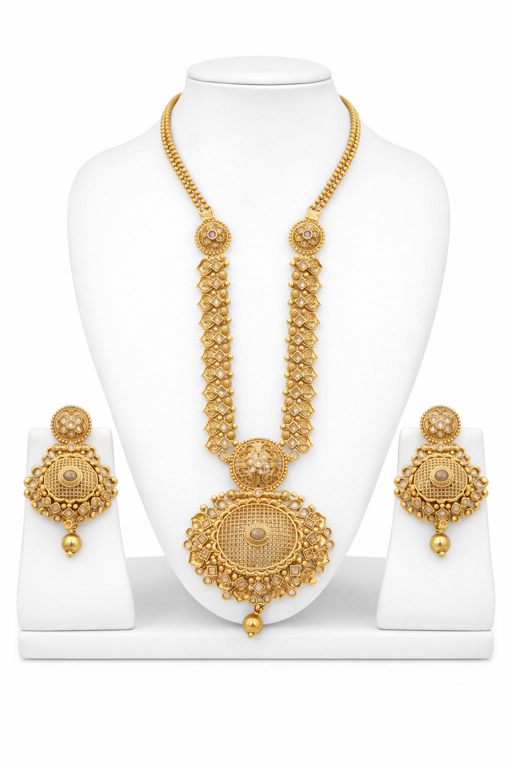 An exquisite expression of traditional craftsmanship, this temple-inspired long necklace set is designed to make a bold and regal statement. Featuring intricate antique gold detailing, the piece showcases beautifully aligned geometric motifs along the chain, leading to a grand circular pendant adorned with fine filigree work and subtle stone embellishments.The matching earrings mirror the elegance of the pendant, completing the look with perfect symmetry and timeless charm. Ideal for weddings, festive occasions, and cultural celebrations, this set blends heritage artistry with modern elegance.