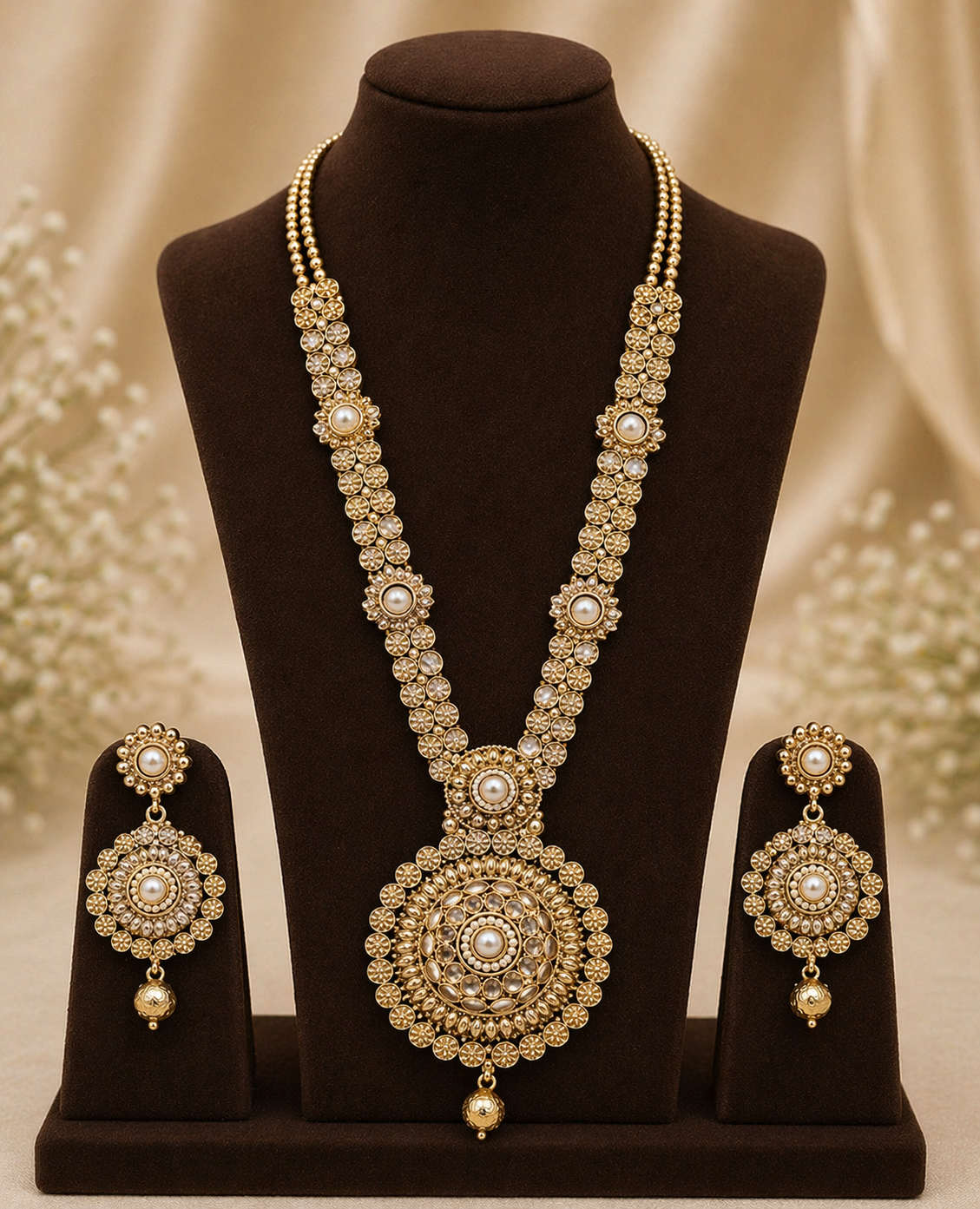 Temple Jewellery Set – Gold Finish with Pearl Crystal AccentsTimeless elegance meets intricate craftsmanship in this stunning temple jewellery set. Designed with finely detailed coin motifs along the chain, this piece reflects classic South Indian heritage with a refined modern touch.