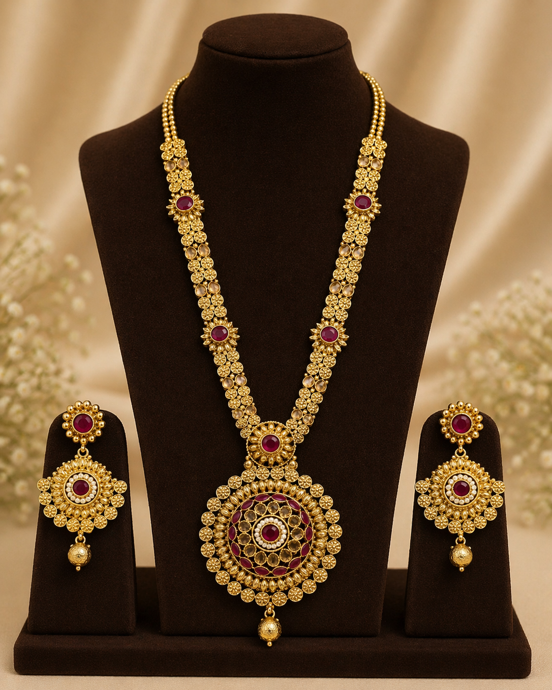 Paired with matching earrings that mirror the pendant’s intricate detailing, this set creates a complete, graceful look.