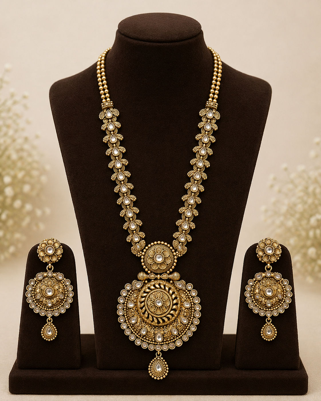 Temple Jewellery Set – Gold Finish with Pearl HighlightsRefined, graceful, and timeless — this temple jewellery set is designed for those who appreciate understated luxury. Crafted with intricate traditional detailing, the necklace features a beautifully structured chain with delicate motifs, leading to a grand circular pendant.