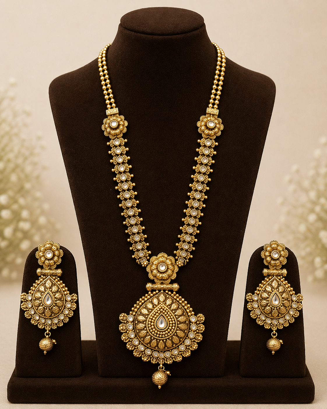 Gracefully crafted with intricate traditional artistry, this temple jewellery set is a true celebration of heritage design. The long necklace features finely detailed motifs along the chain, leading to a striking teardrop-shaped pendant that exudes elegance and sophistication.