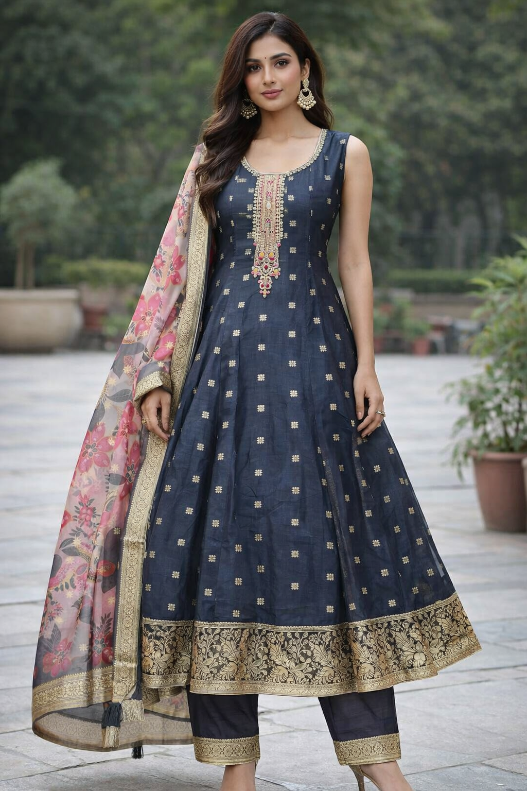 Elevate your ethnic wardrobe with this elegant navy blue Anarkali suit, crafted to exude timeless charm and festive sophistication. The Anarkali features delicate gold woven motifs all over, beautifully complemented by intricate embroidery on the neckline with subtle pink accents that add a refined feminine touch. The flared silhouette enhances movement, giving the outfit a graceful and flowy appeal.Paired with matching straight-fit pants detailed with an elegant gold border at the hem, the ensemble ensures both comfort and style. Completing the look is a soft floral printed dupatta, finished with a rich gold border, adding contrast and vibrancy to the overall design.Perfect for festive celebrations, weddings, family gatherings, and evening functions, this Anarkali suit effortlessly blends traditional craftsmanship with modern elegance.