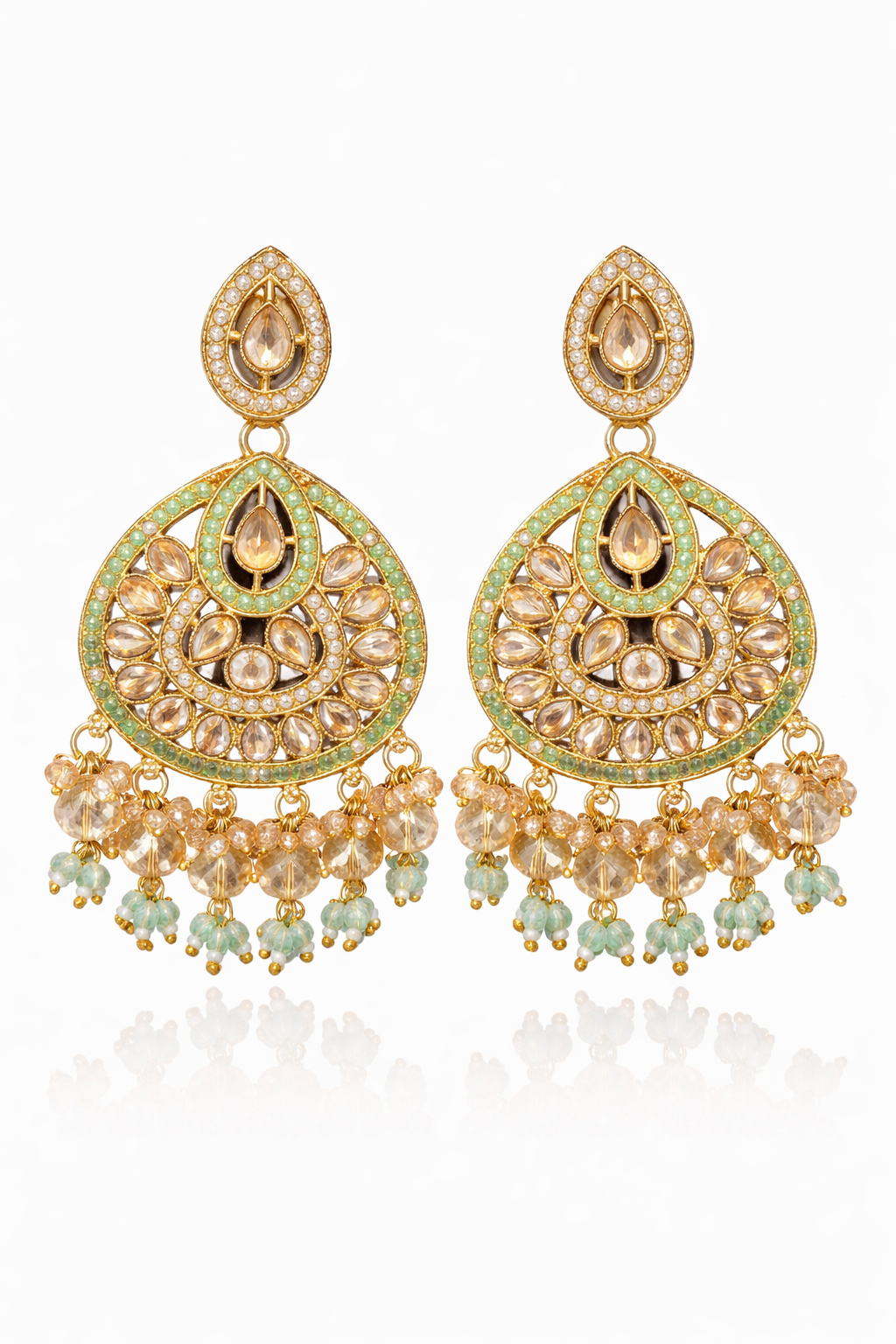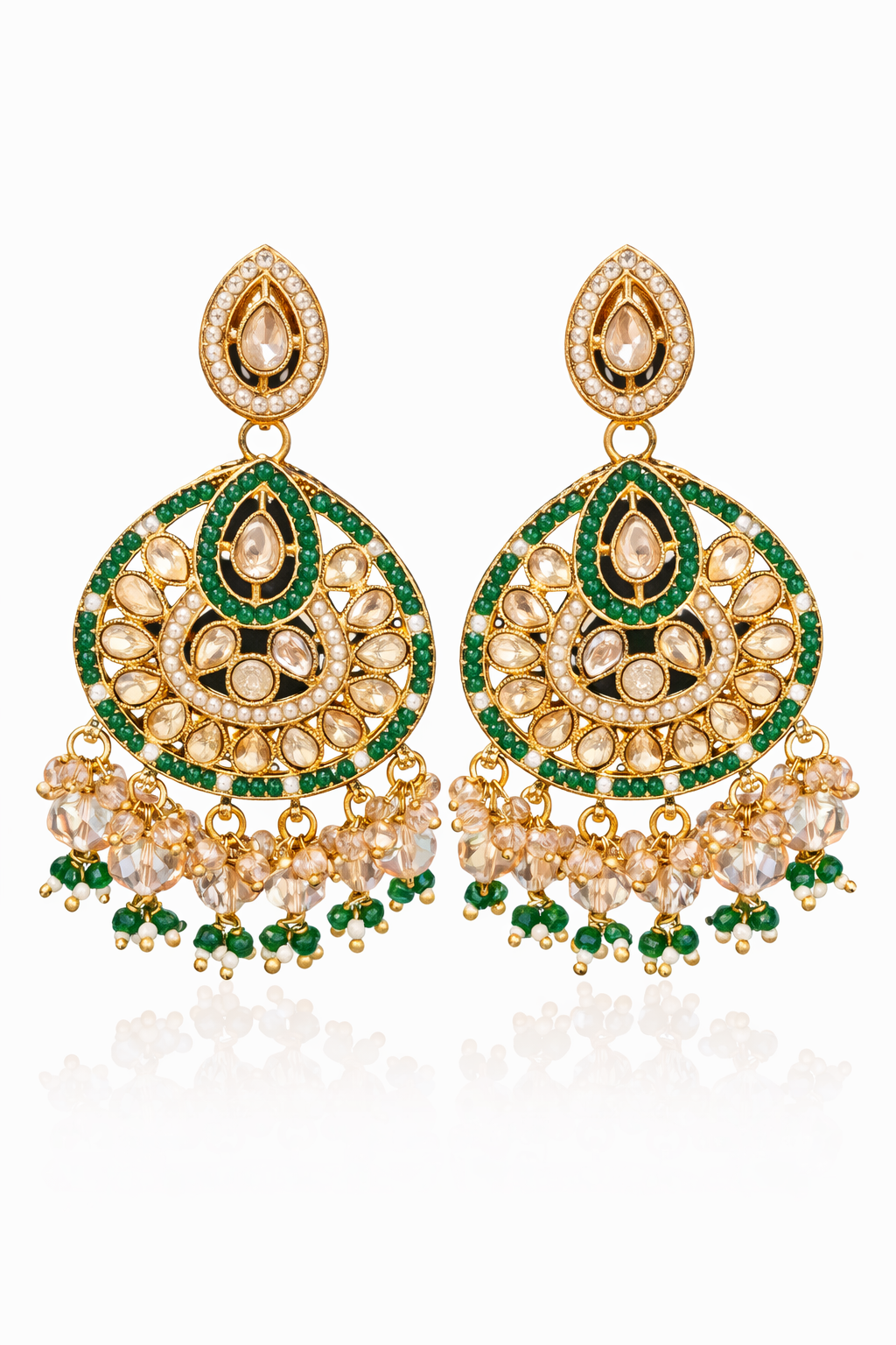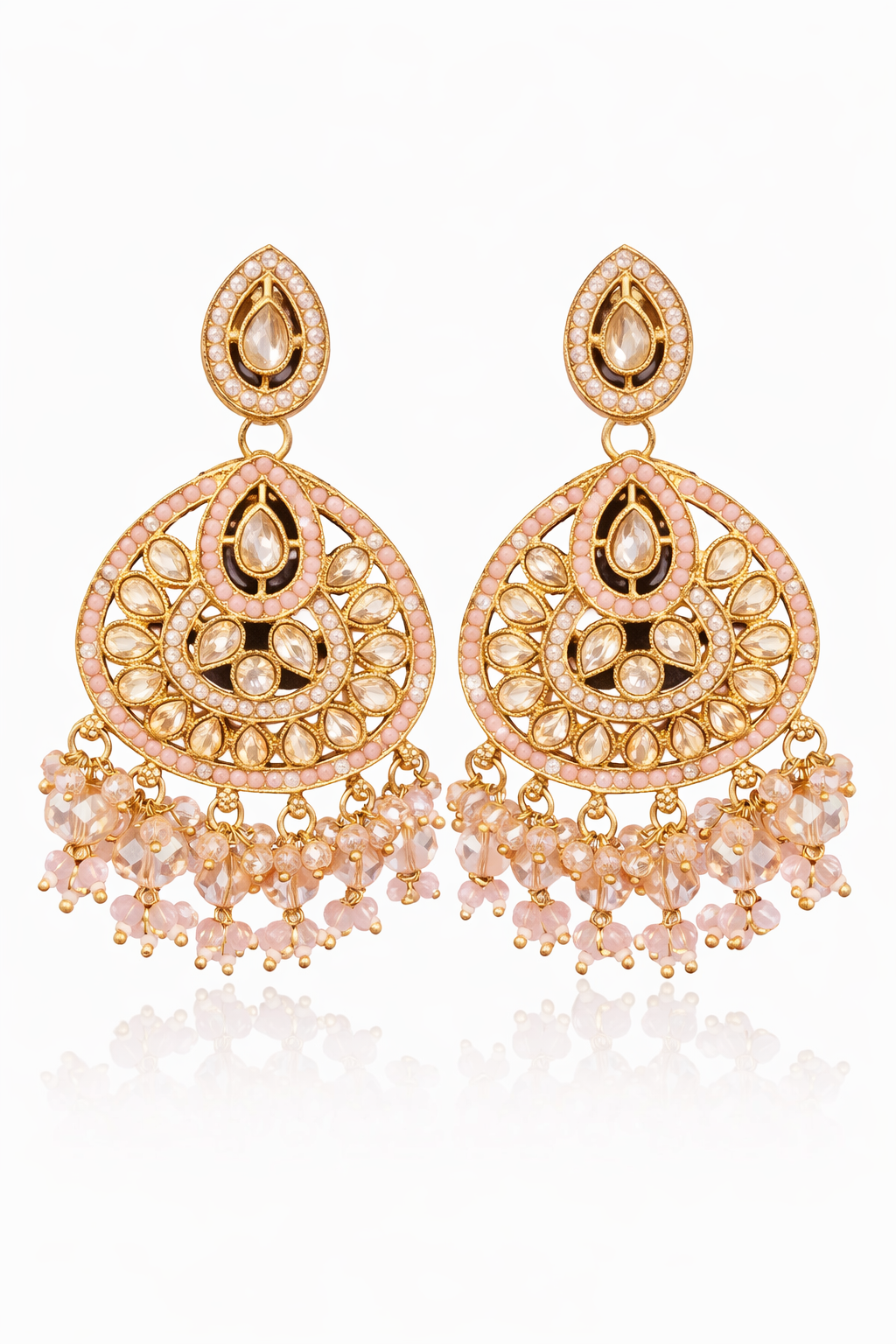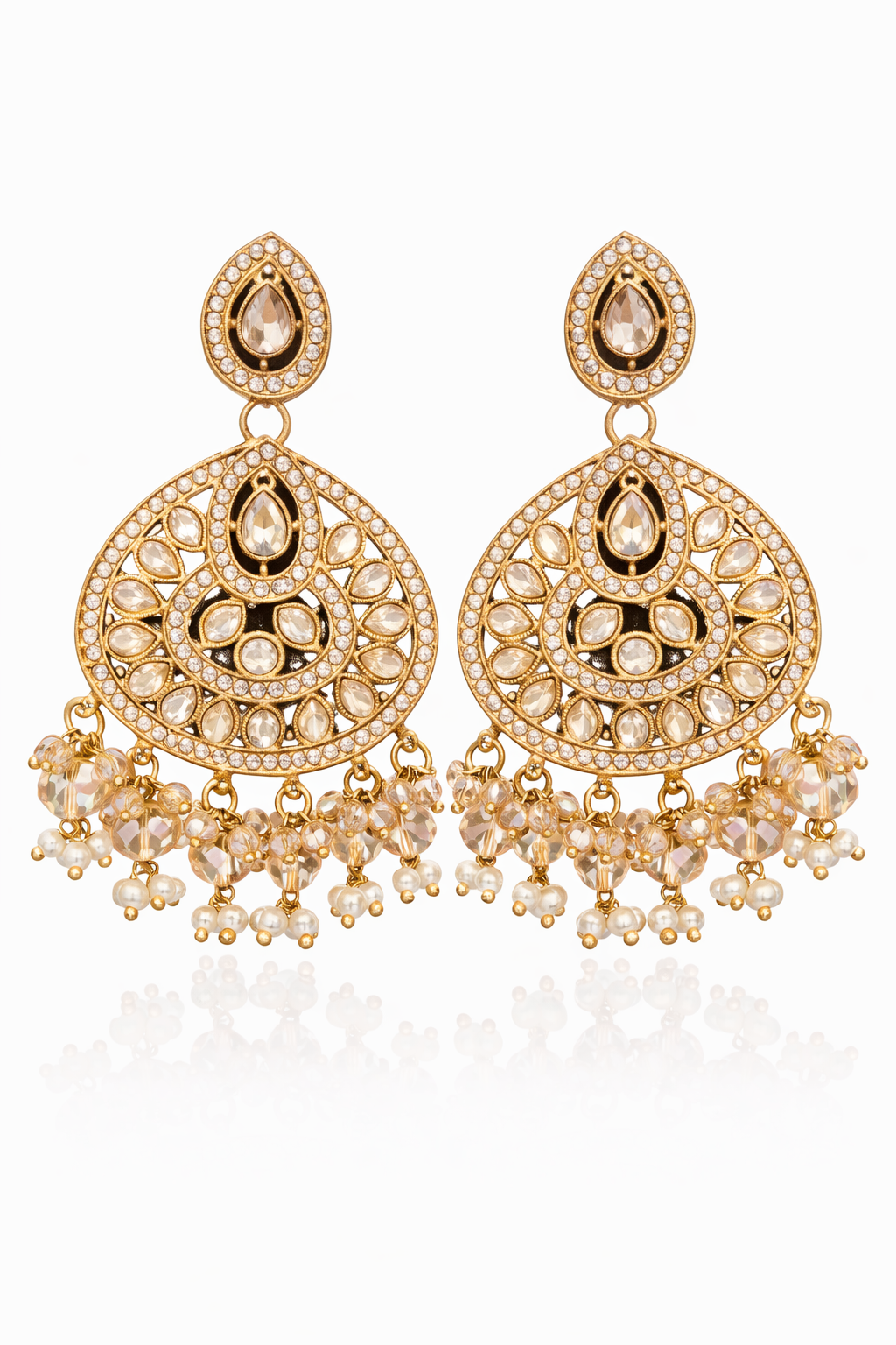 Add timeless elegance to your ethnic look with these beautifully crafted traditional chandelier earrings. Designed in a classic kundan style, the earrings feature a graceful teardrop stud adorned with shimmering champagne stones and delicate pearl detailing. The circular drop is intricately set with multiple kundan stones, framed in a rich gold-tone finish that enhances their royal appeal. Finished with cascading crystal and pearl bead drops, these earrings offer graceful movement and a luxurious finish.