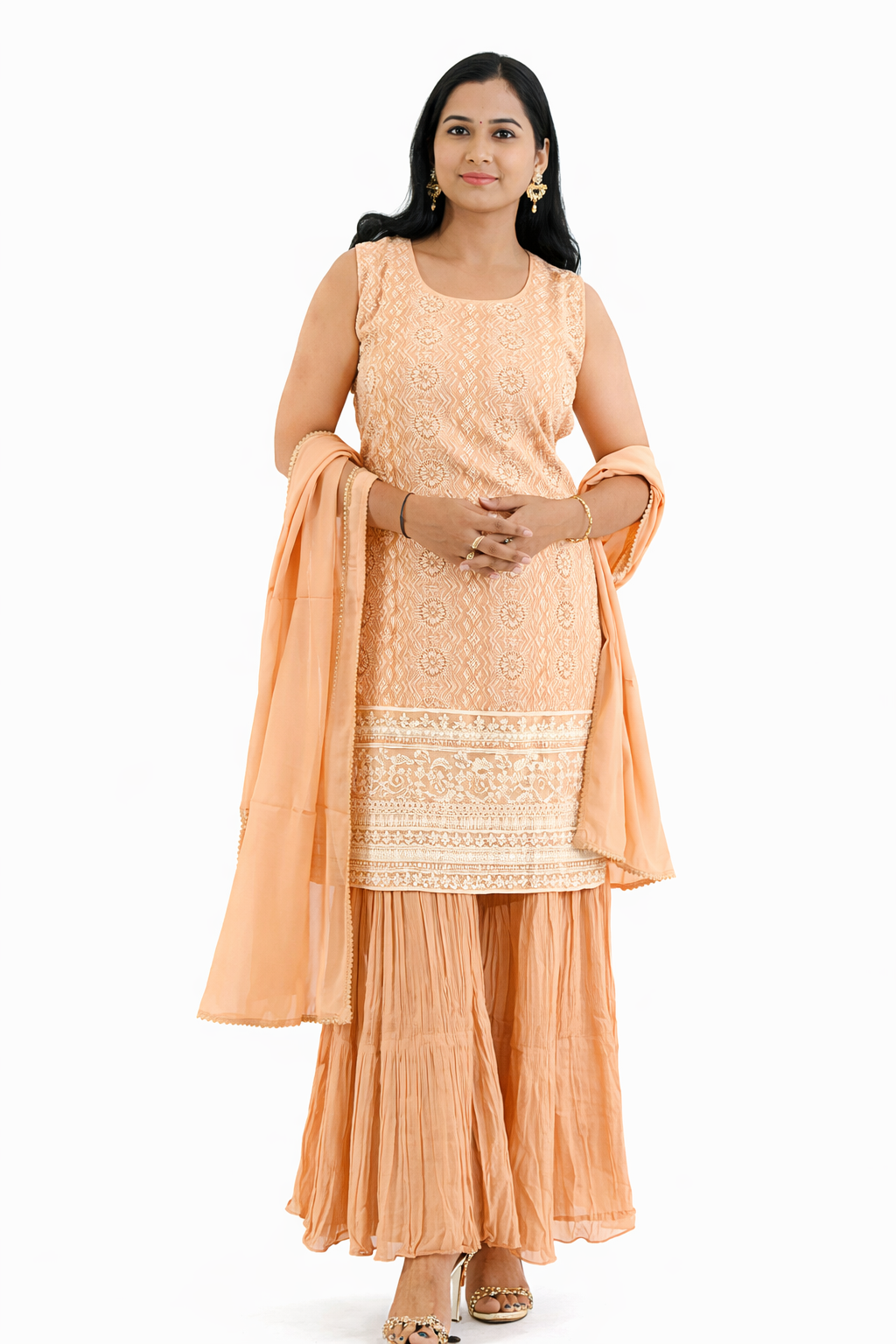 Step into the world of elegance with our Pastels Chikanari Sharara Suit, a perfect blend of sophistication and comfort. Crafted in breathable Georgette, this ensemble is adorned with delicate Chikankari works, adding a touch of timeless charm. Embrace the subtlety of pastels while reveling in the graceful silhouette of the palazzo suit, creating an outfit that's both stylish and breathable for any occasion.