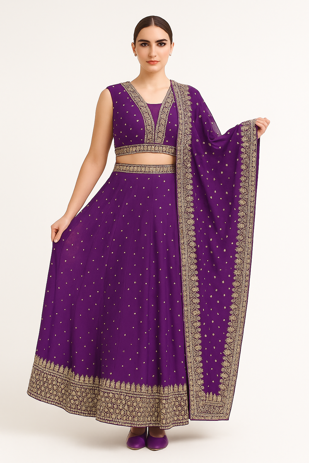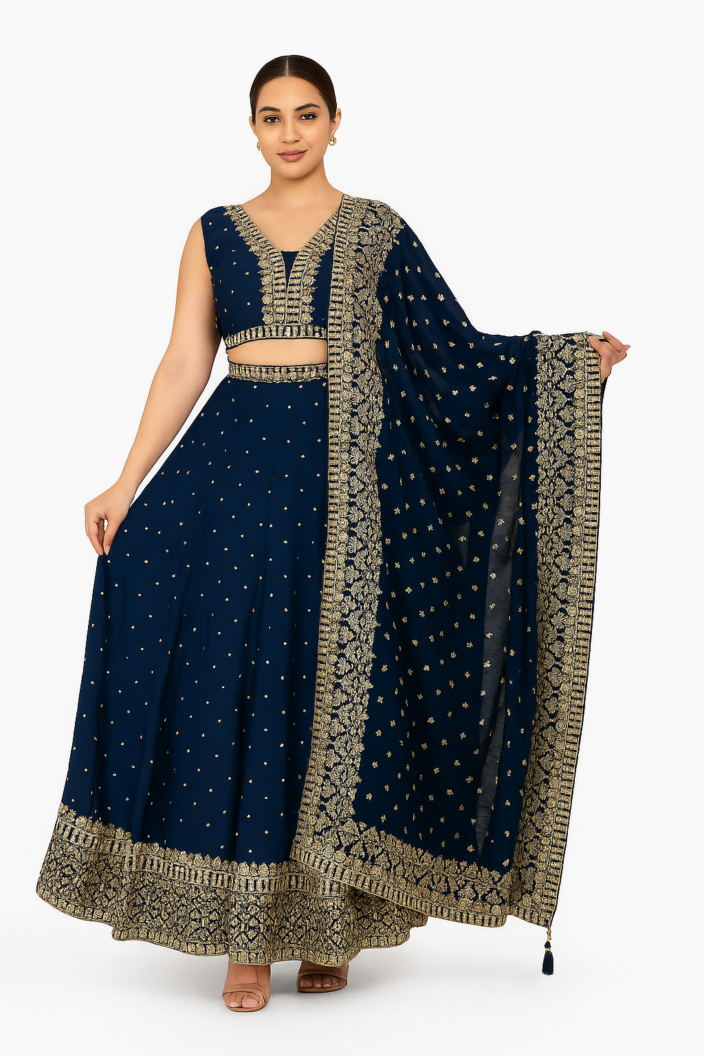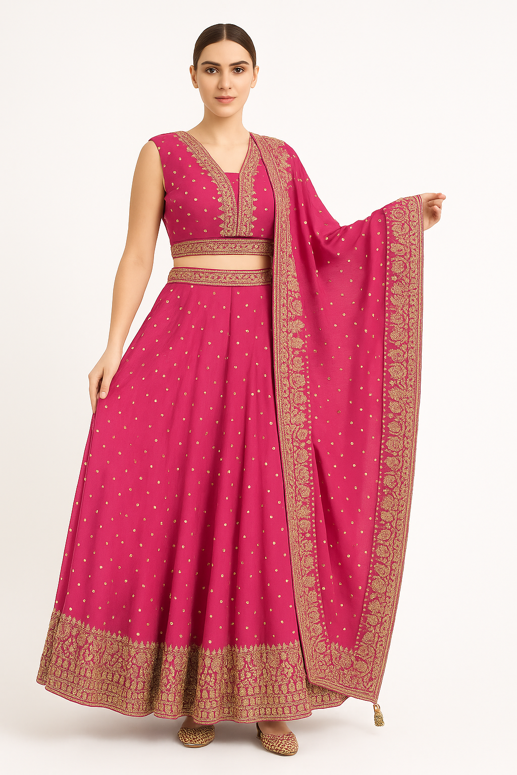 Experience timeless beauty with this embroidered lehenga choli set, designed with both sleeveless and attached sleeve options for versatile styling. The outfit features a V-neck embroidered blouse adorned with intricate gold zari and sequin detailing, paired with a gracefully flared skirt enhanced by rich golden motifs and a heavy embroidered border. A matching dupatta with ornate embroidery and tassel details completes this royal ensemble.