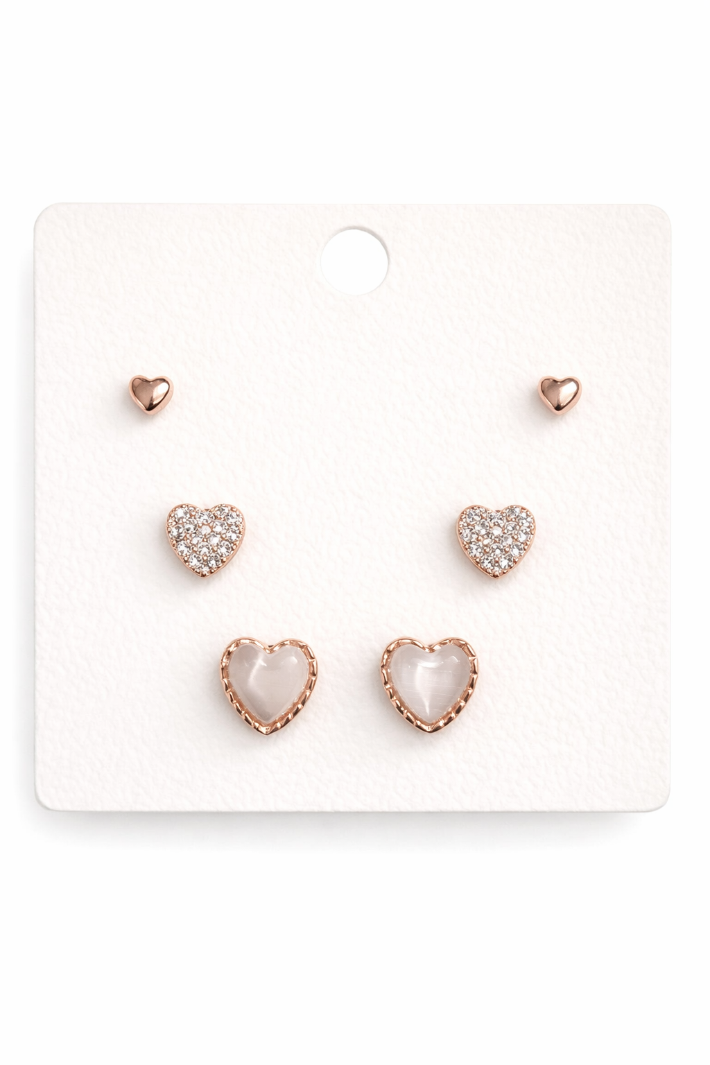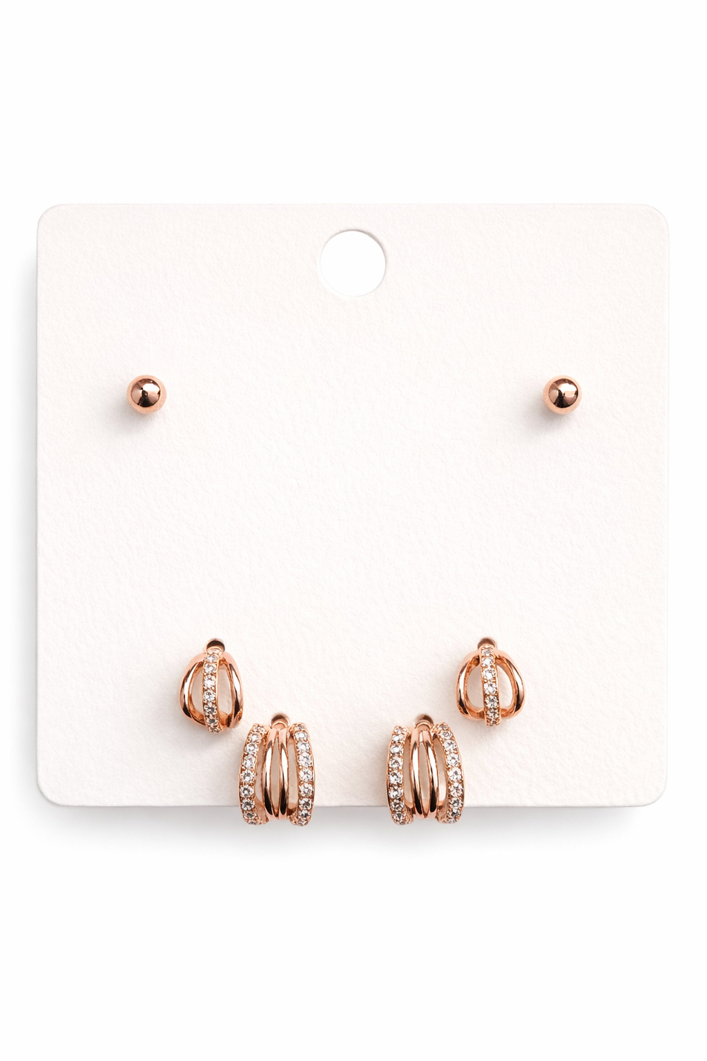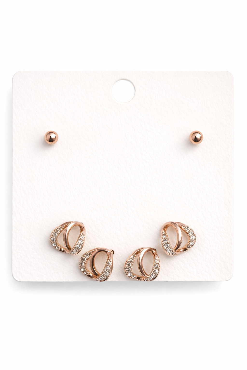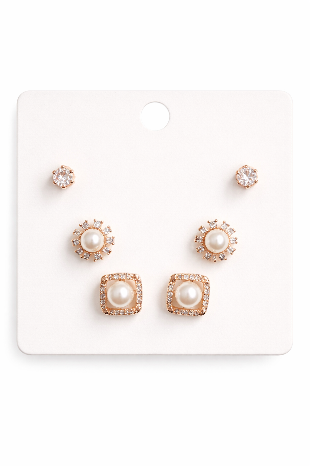 Elevate your everyday style with this elegant 3-pair stud earring set in a rose-gold finish. Featuring classic crystal solitaire studs, pearl halo studs with sparkling stones, and modern square-frame pearl studs, this set is perfect for mixing and matching from day to night. Lightweight, comfortable, and beautifully polished for a premium look—ideal for gifting or completing your festive outfits.