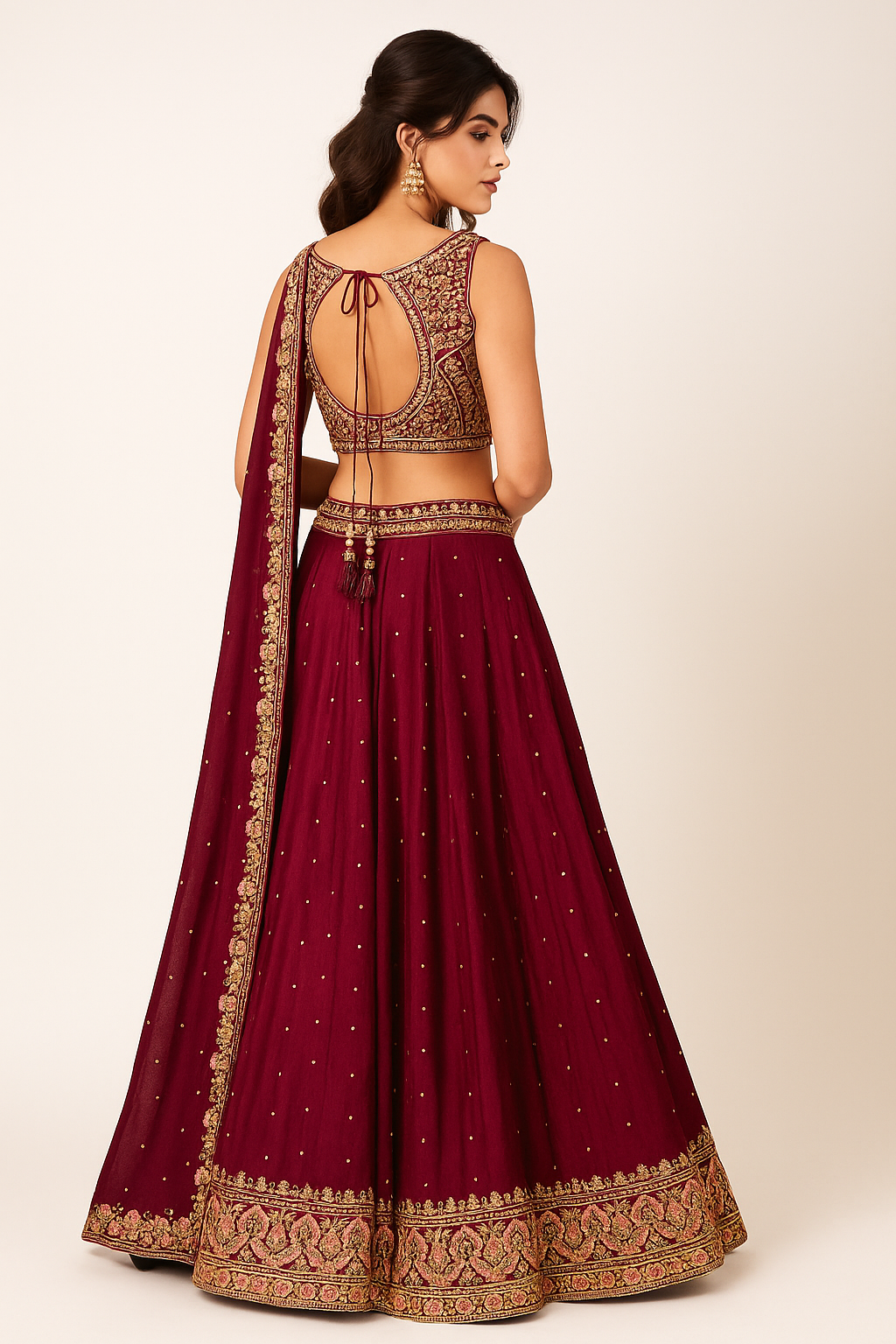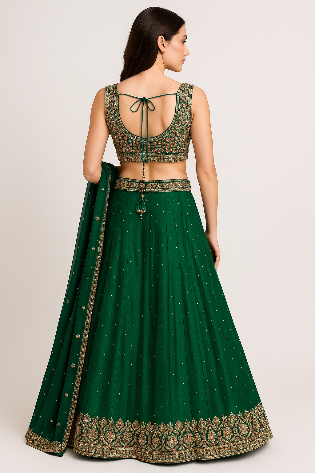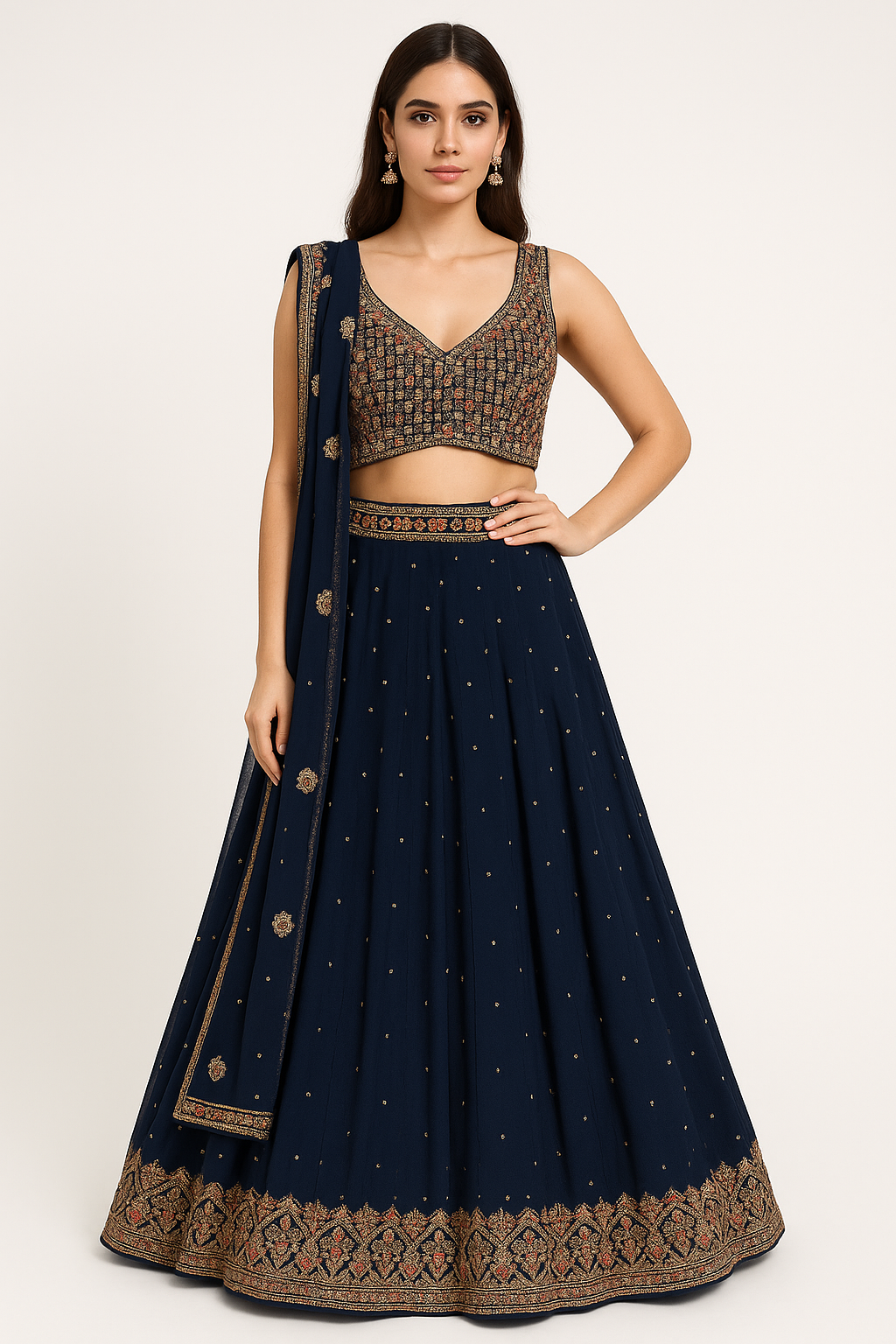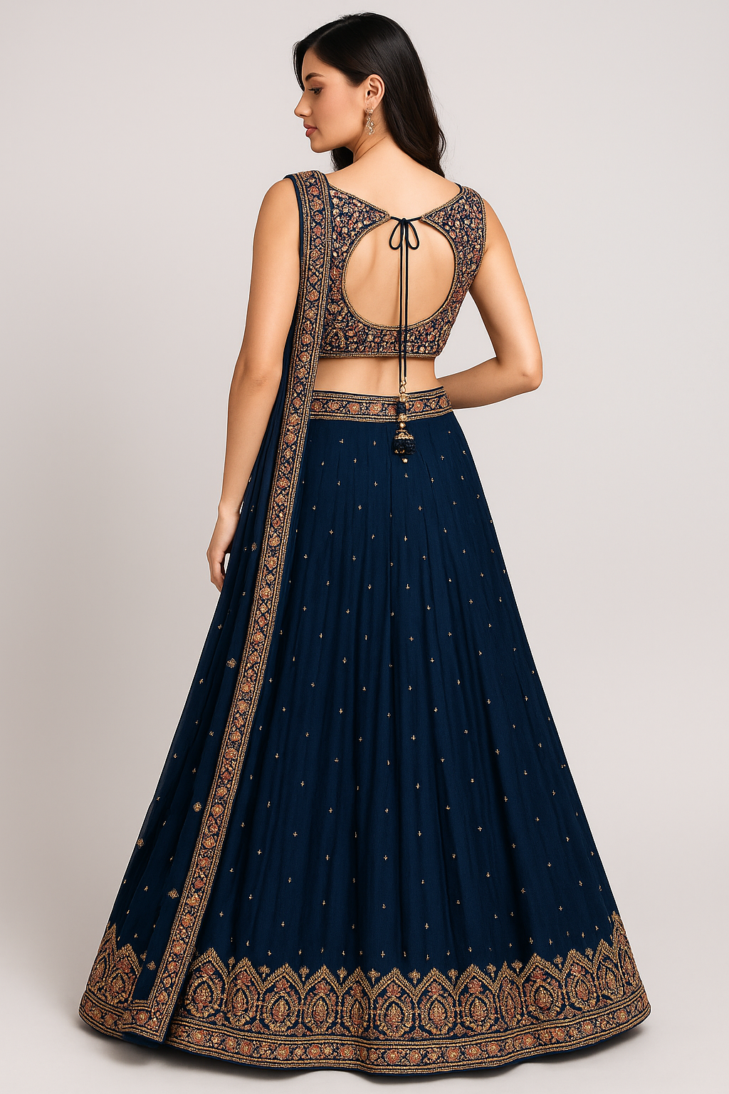 Elevate your festive and bridal wardrobe with this luxurious Lehenga Set, crafted with intricate hand-embroidered detailing. The rich navy tone beautifully complements the delicate zari, thread, and sequin work, creating a timeless and regal look.