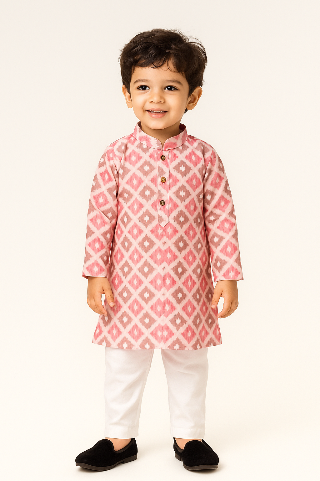 Give your little one a stylish festive look with this beautifully crafted boys’ sherwani suit. Designed in a soft pink Ikat pattern, the sherwani features delicate sequin work that adds a subtle shimmer without being overpowering. The front is finished with three elegant buttons, enhancing its traditional charm.