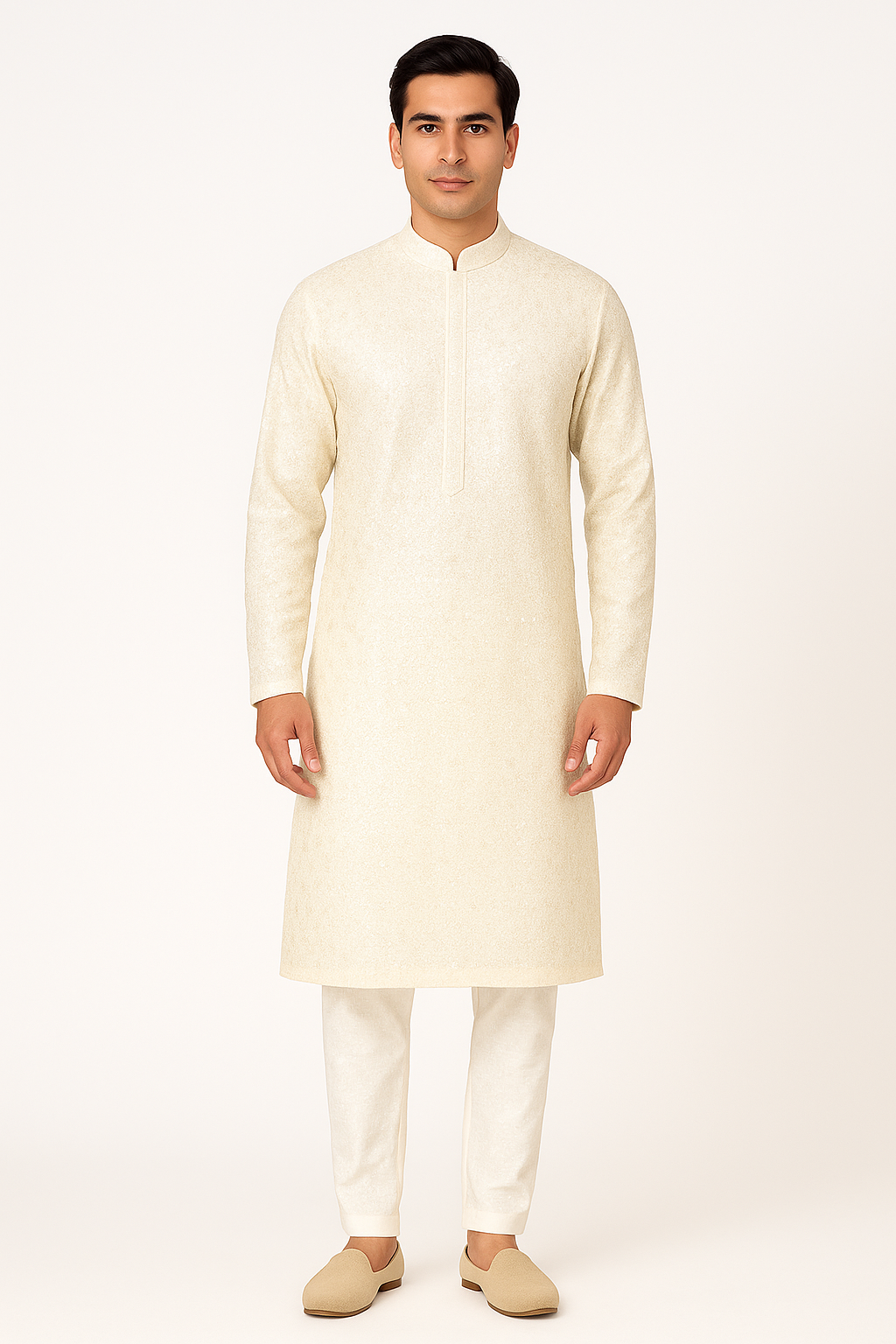 Add sophistication to your festive look with this Men’s Off-White Sequin Work Long Kurta Set. Crafted with fine embroidery and intricate sequin detailing, this kurta radiates subtle elegance and charm. The rich texture and refined craftsmanship make it perfect for celebrations, weddings, and formal occasions.