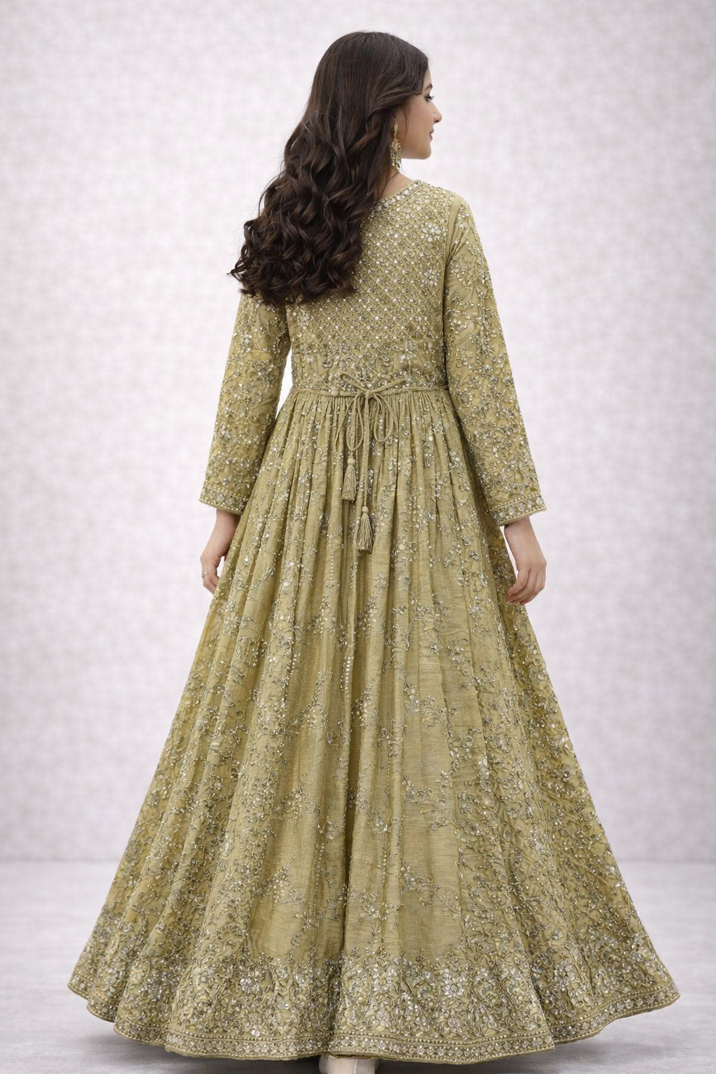 Make every occasion special with this stunning olive green full-length girls gown, designed to deliver elegance and comfort in one beautiful outfit. Featuring rich all-over embroidery with delicate mirror and sequin detailing, this gown reflects a luxurious ethnic charm ideal for festive celebrations.