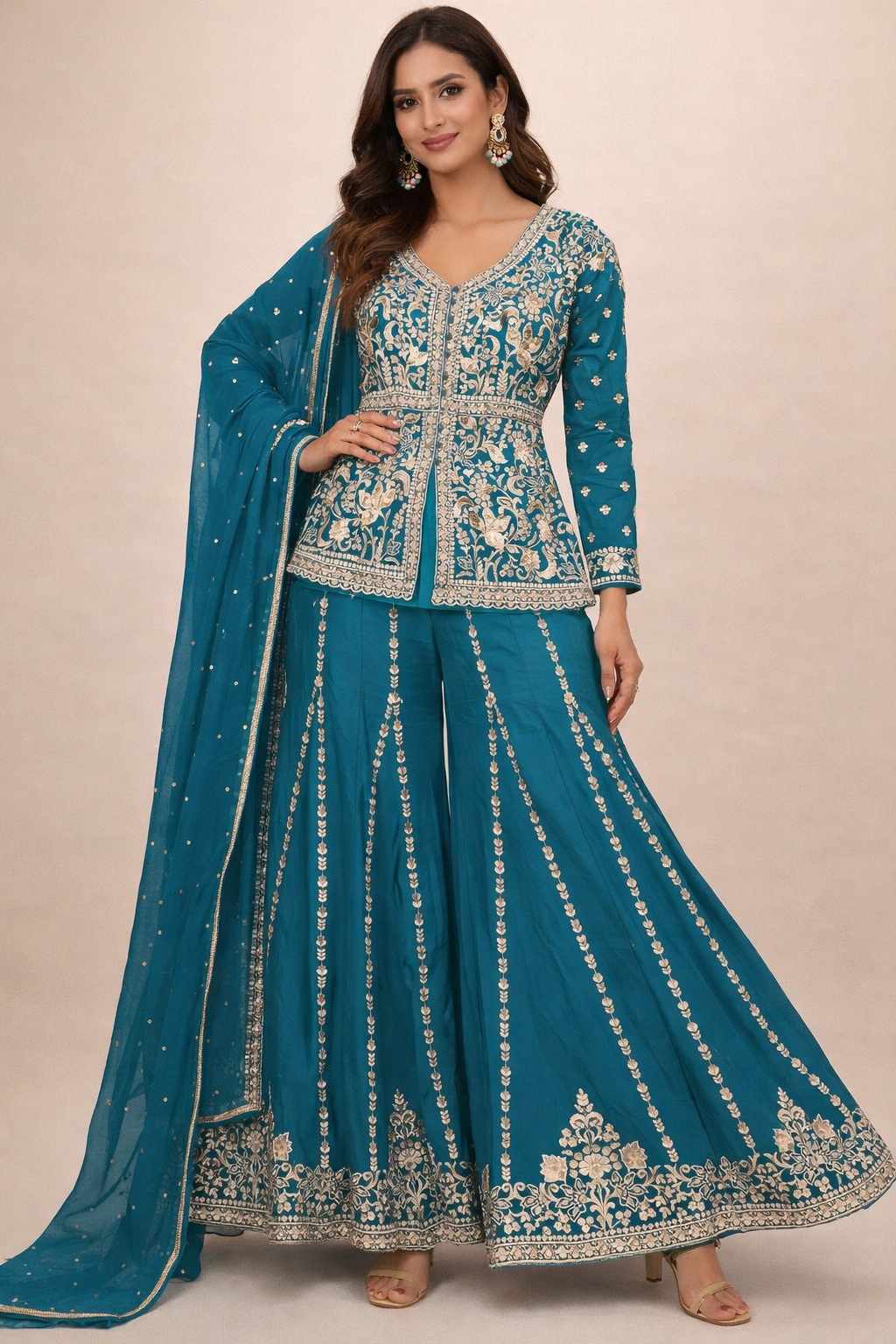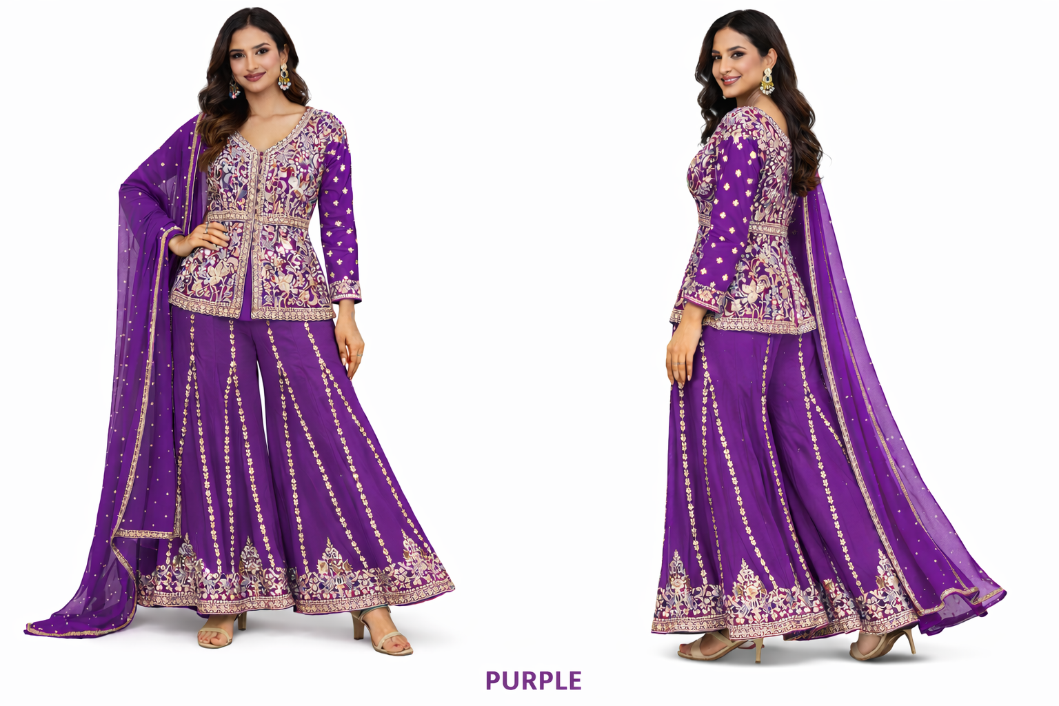 Make a graceful statement with this elegant short top and flare palazzo suit, designed to bring together traditional artistry and modern charm. Crafted in a rich purple hue, the ensemble features a beautifully embroidered short top with intricate gold detailing that adds a luxurious touch. The extra-flare palazzo pants are adorned with delicate vertical embroidery, creating a flowy and flattering silhouette with every movement.Paired with a matching dupatta enhanced with subtle embellishments, this outfit is perfect for festive celebrations, weddings, parties, and special occasions. Style it with statement earrings and heels for a complete ethnic look that stands out effortlessly.