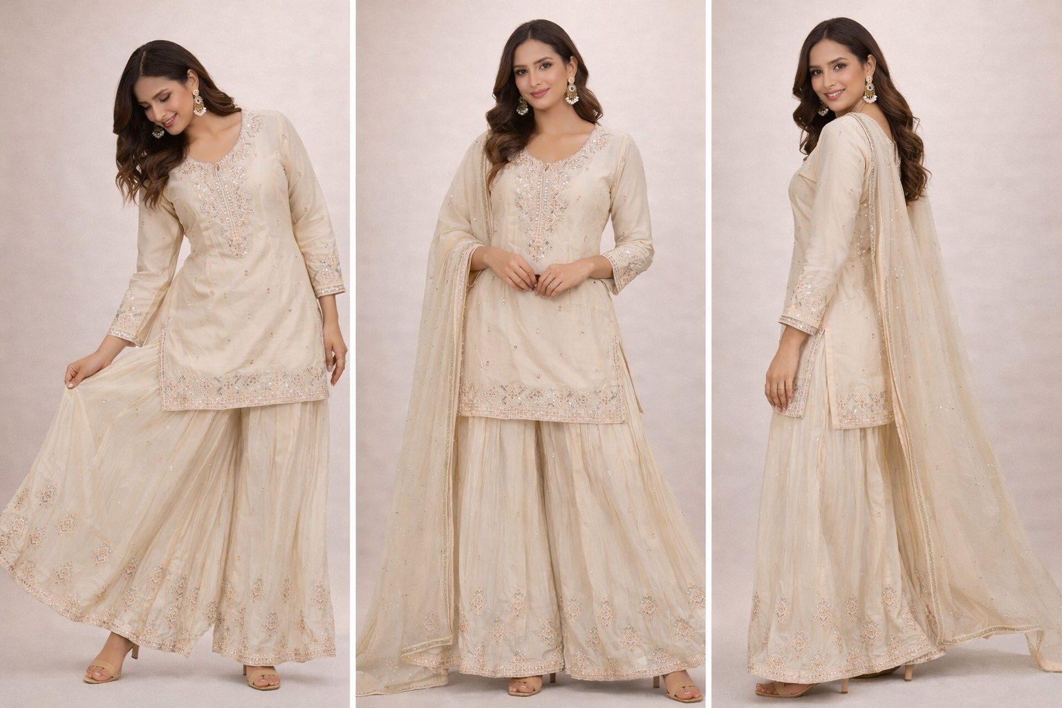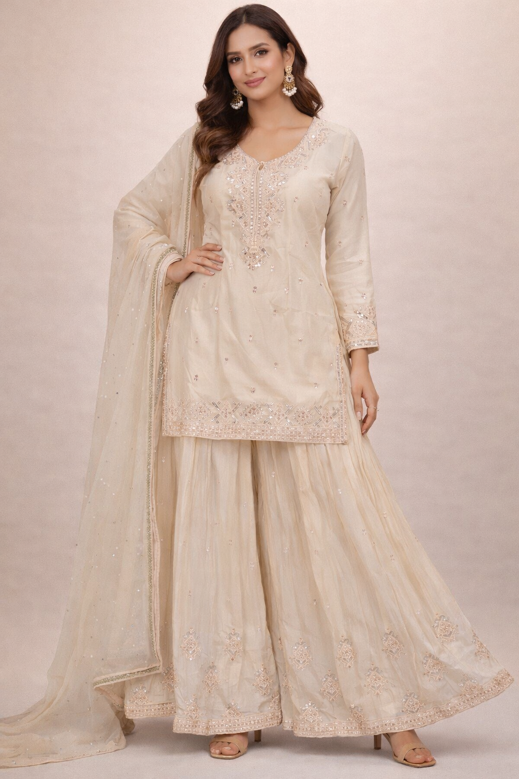 Elevate your ethnic wardrobe with this elegant flare palazzo suit, designed for timeless grace and effortless comfort. Crafted in a soft cream-beige shade, the short kurta features delicate sequin and thread embroidery along the neckline, sleeves, and hem, giving it a refined and luxurious appeal.The matching flared palazzo pants add beautiful volume and movement, enhanced with subtle all-over embroidery that complements the kurta perfectly. Finished with a lightweight, sheer dupatta accented with fine detailing, this ensemble is ideal for festive gatherings, weddings, engagement functions, and evening celebrations.