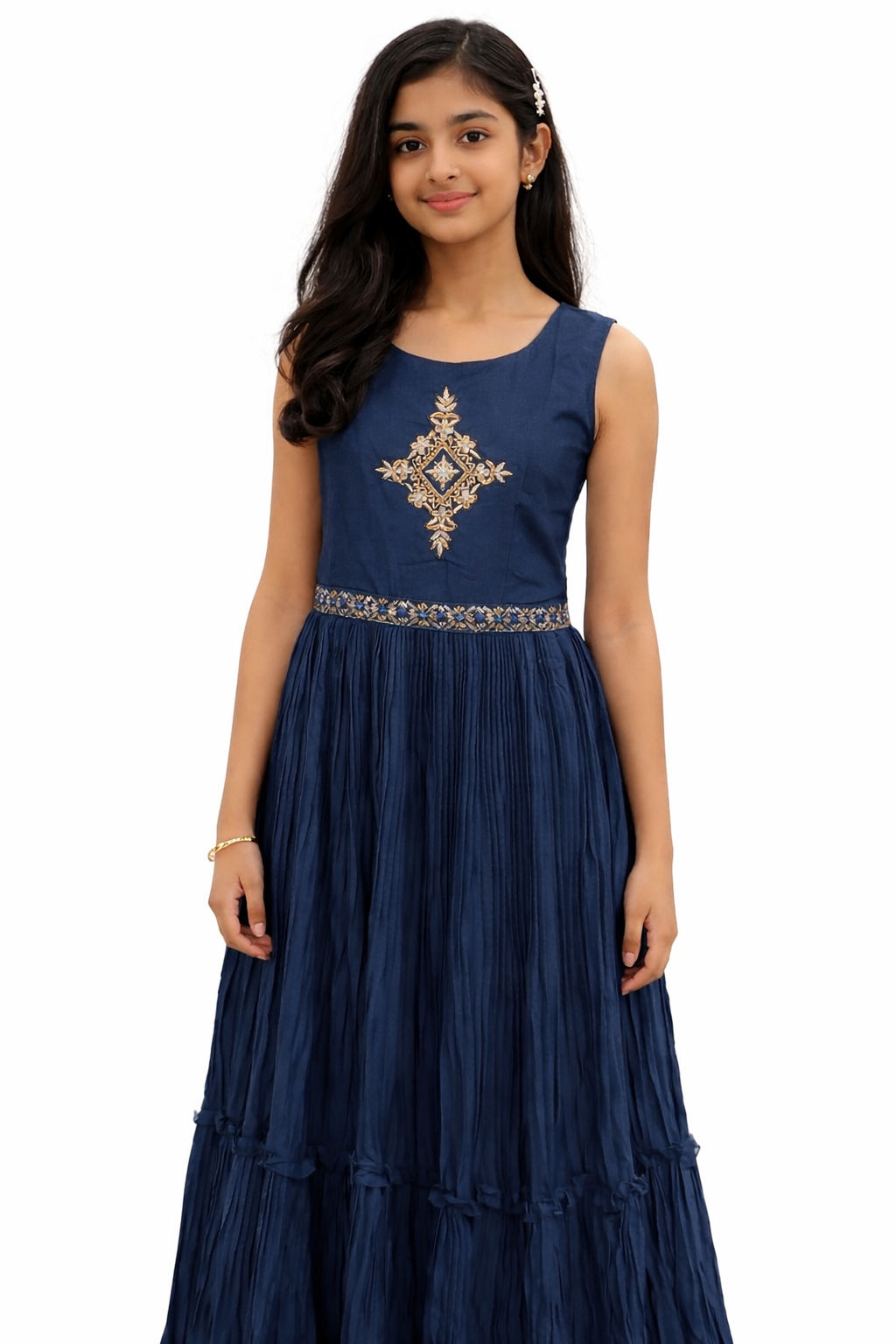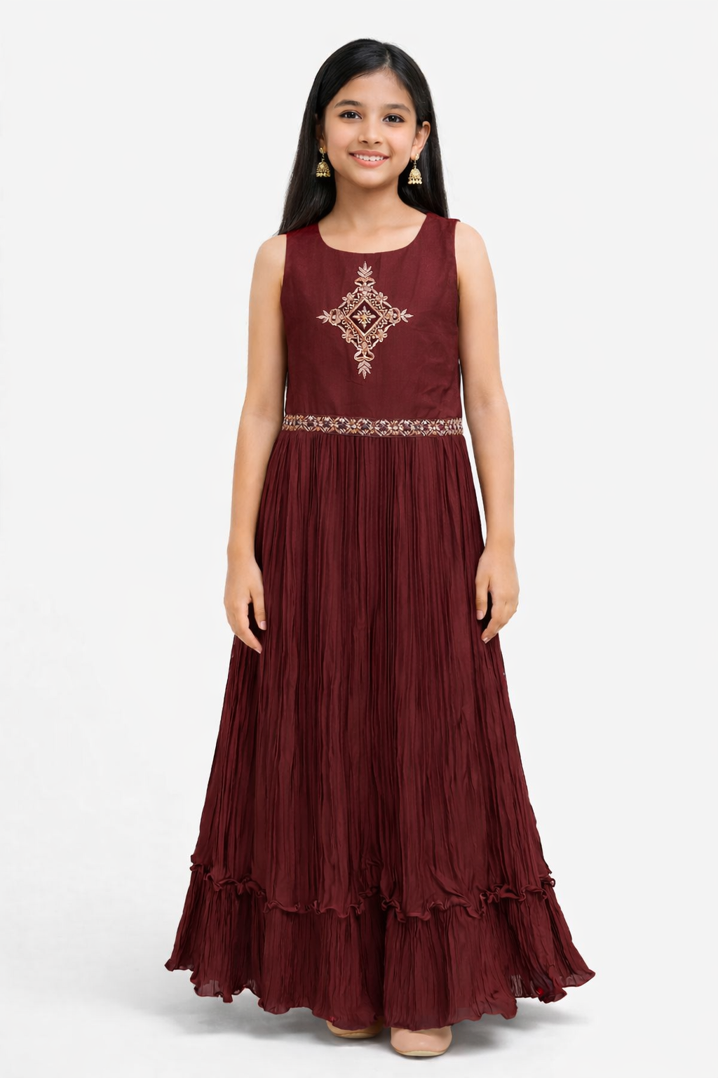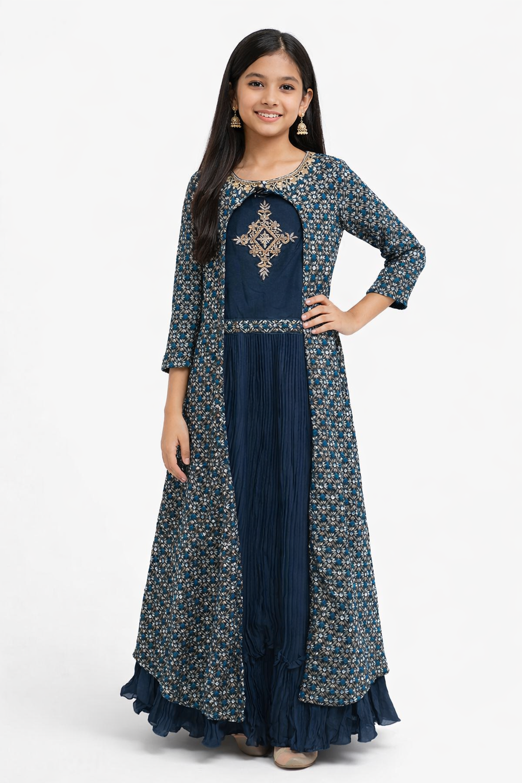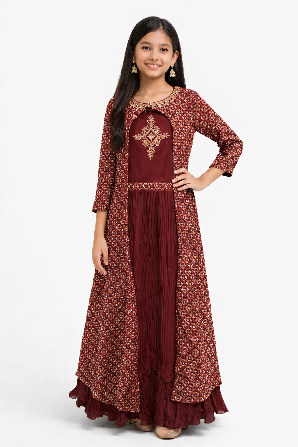 This beautifully crafted girls gown features a timeless Anarkali silhouette paired with a printed long jacket, creating a graceful and festive look. Designed with intricate all-over traditional prints, the gown flows effortlessly with a pleated flare at the bottom, adding movement and charm.The front showcases a neatly finished bodice with coordinated prints, while the back maintains a clean, elegant continuation of the same pattern for a polished look from every angle. The three-quarter sleeves and comfortable fit make it perfect for young girls, blending style with ease of wear.Ideal for festive occasions, family functions, weddings, cultural programs, and celebrations.Style: Gown with Jacket StyleFit: Comfortable, Flared AnarkaliSleeves: 3/4 LengthNeckline: Classic Round / V-Detail (as shown)Occasion: Festive, Wedding, Party, Traditional EventsAge Group: Girls (Approx. 14–16 Years)Care Instructions: Gentle hand wash separately, dry in shade