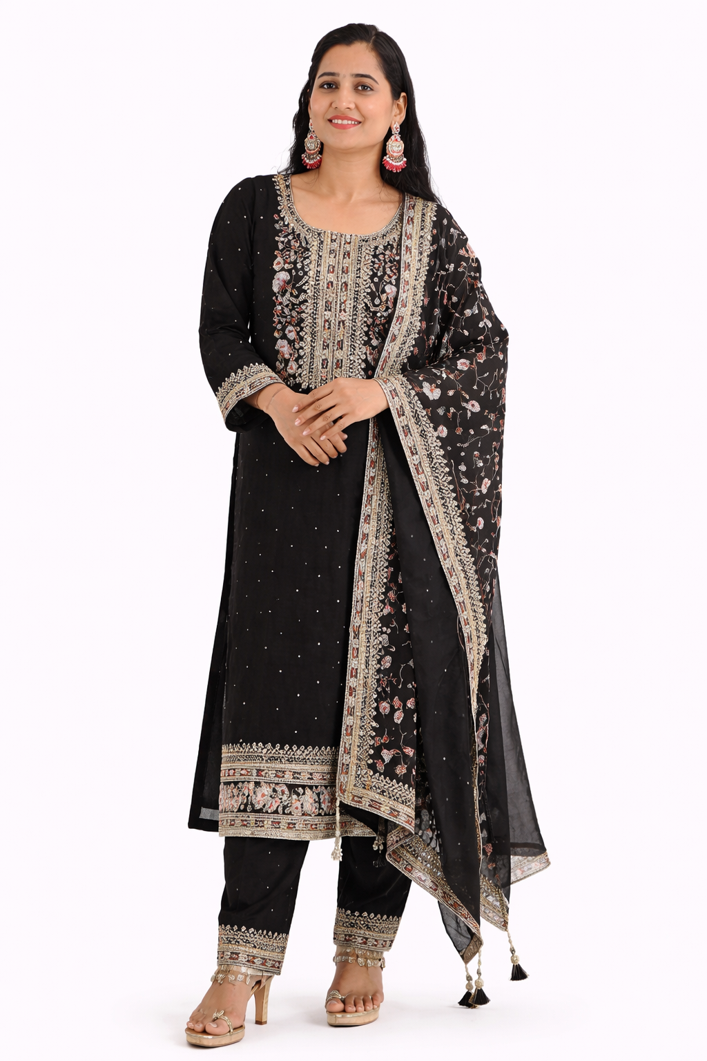 This classic black suit set is crafted for timeless elegance and refined festive wear. The straight-cut kurta features intricate multicolour embroidery along the neckline, front panel, sleeves, and hem, creating a rich and detailed finish. Paired with matching straight pants, the ensemble is completed with a beautifully embroidered chiffon dupatta accented with delicate tassel detailing, adding graceful movement and charm.