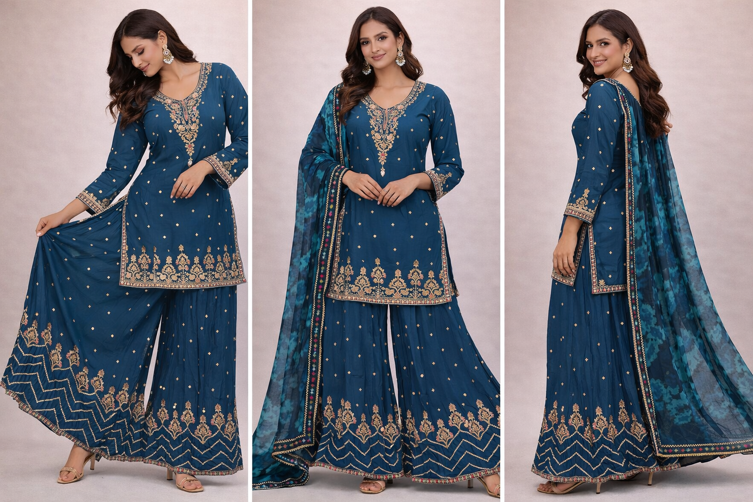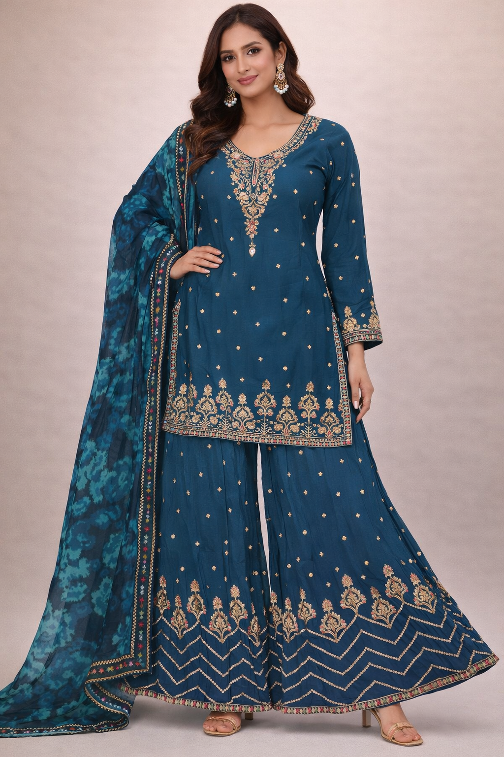 Step into effortless elegance with this beautifully crafted flare palazzo suit in a rich teal blue shade. The short kurta features an intricately embroidered V-neckline with fine multicolour thread and zari-style detailing, complemented by delicate butti work scattered across the fabric. A heavily embroidered border along the hem adds a luxurious finish to the silhouette.