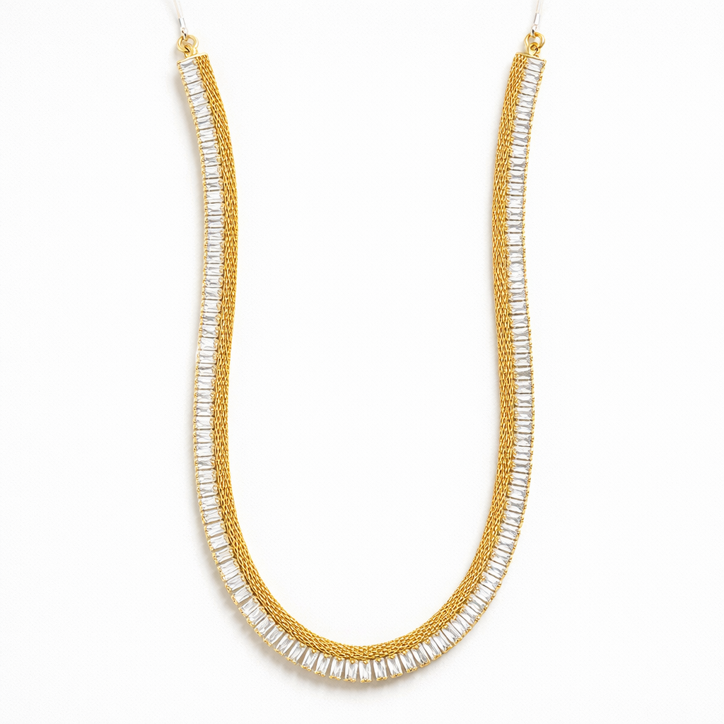 Elegant and contemporary, this dual-layer necklace is designed to elevate both everyday and occasion wear. Crafted with a finely woven gold-tone chain, it is paired with a sleek row of baguette-cut stones that create a refined, high-shine finish. The contrast between the soft gold texture and the structured sparkle gives this piece a modern luxury appeal.