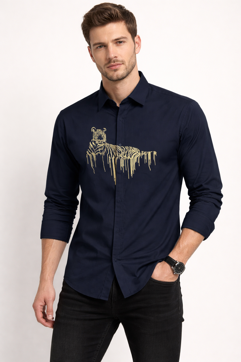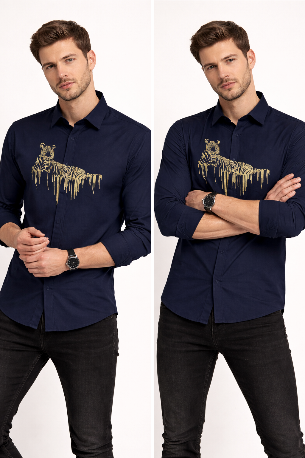 Make a bold yet refined statement with this navy blue designer shirt, featuring a striking gold tiger artwork across the chest. The artistic tiger design adds a touch of power and sophistication, making this shirt a standout choice for men who like their style confident and distinctive.Tailored in a modern slim fit, this shirt offers a sharp silhouette while ensuring all-day comfort. The deep navy base perfectly complements the gold detailing, creating a luxurious look that transitions effortlessly from evening outings to festive occasions.