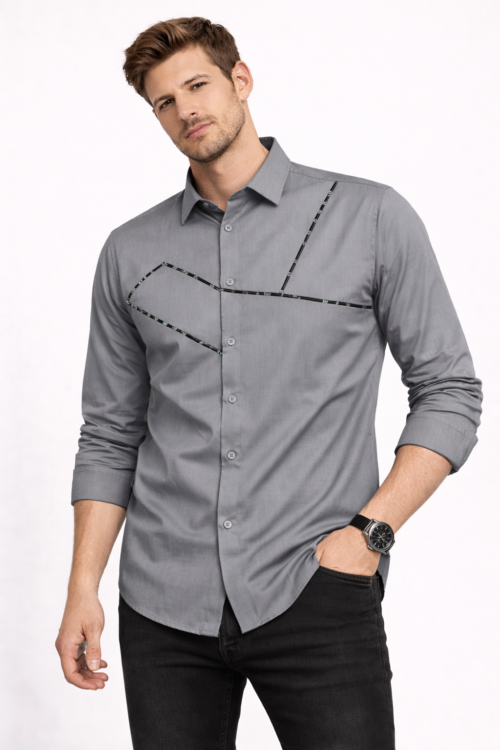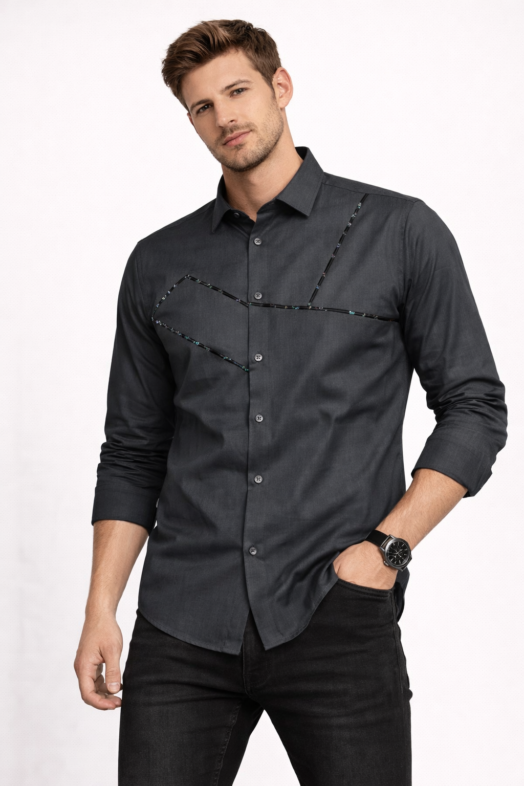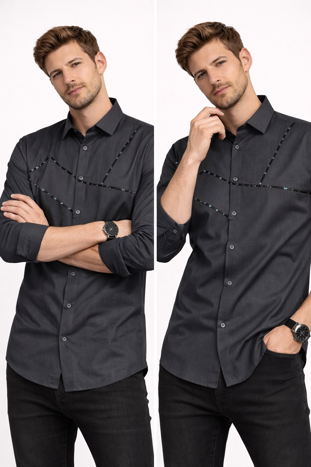 Step into refined elegance with this navy blue designer shirt, highlighted by striking geometric bead detailing across the chest. The subtle yet eye-catching pattern adds a modern artistic edge, making this shirt perfect for men who appreciate contemporary design with a sophisticated finish.Tailored in a slim fit, this shirt offers a sharp silhouette while ensuring comfort throughout the day. The deep navy blue tone enhances the contrast of the bead work, creating a polished look suitable for evening wear, festive occasions, and upscale casual outings.