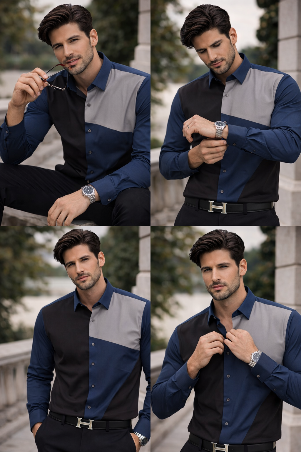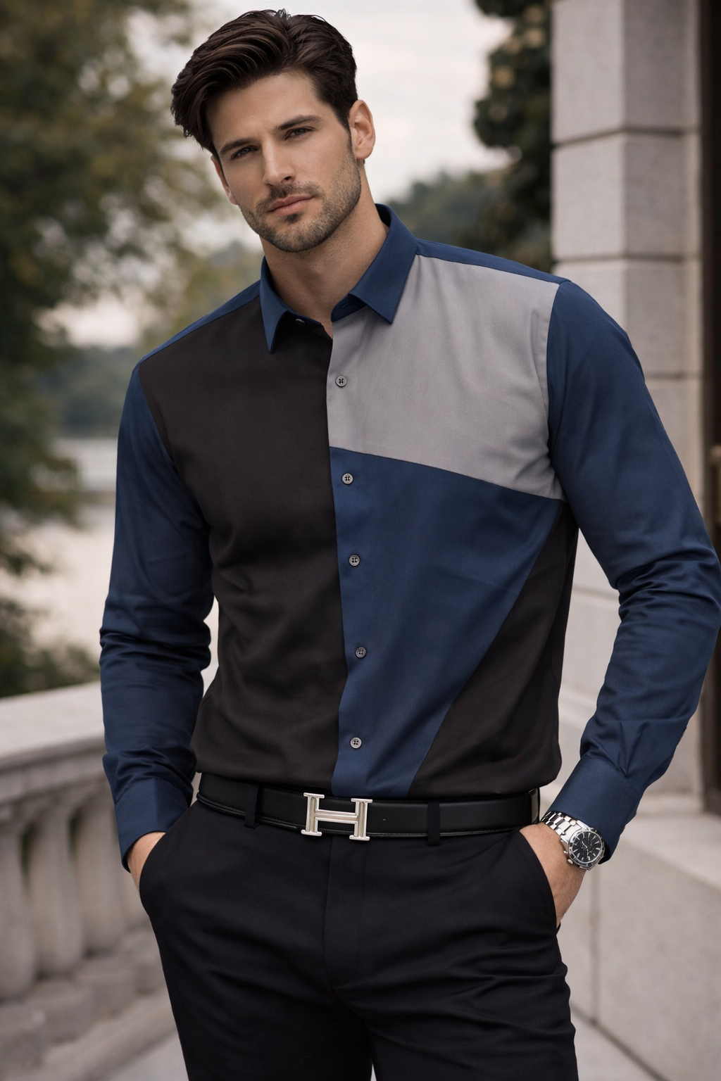 Make a bold yet refined statement with this modern men’s colour-block shirt, designed for the confident contemporary man. Featuring a striking geometric panel design in navy blue, black, and grey tones, this shirt blends smart tailoring with a fashion-forward edge.Crafted from a smooth, breathable fabric, it offers a sharp silhouette with all-day comfort. Whether styled for evening outings, smart casual wear, or statement office looks, this shirt effortlessly elevates your wardrobe.