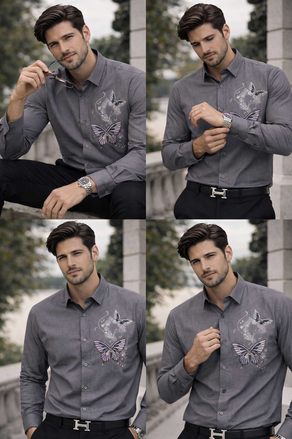 Add a touch of artistic elegance to your wardrobe with this men’s embroidered grey shirt, featuring delicate butterfly motifs beautifully detailed on the chest. Designed for the modern man who appreciates refined craftsmanship, this shirt blends subtle luxury with contemporary style.The soft grey tone provides a versatile base, while the intricate multicolour embroidery adds character without overpowering the look. Tailored for comfort and style, it is perfect for evening wear, festive gatherings, or elevated smart-casual occasions.