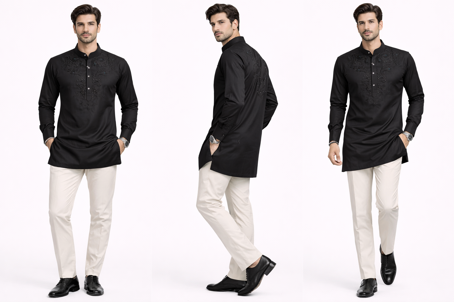 Step into refined elegance with this premium black embroidered kurta, designed for the modern man who appreciates subtle luxury and timeless ethnic style. Crafted in a rich black tone, this kurta features intricate tonal embroidery enhanced with delicate embellishments, creating a sophisticated textured look.The detailed front panel showcases elegant patterns with fine bead accents, adding depth and a premium finish while maintaining a sleek, monochrome aesthetic. The mandarin collar and clean button placket elevate its classic appeal, making it perfect for festive occasions and evening events.Tailored for a sharp and comfortable fit, this kurta pairs effortlessly with light-colored trousers or churidar for a balanced and polished look.