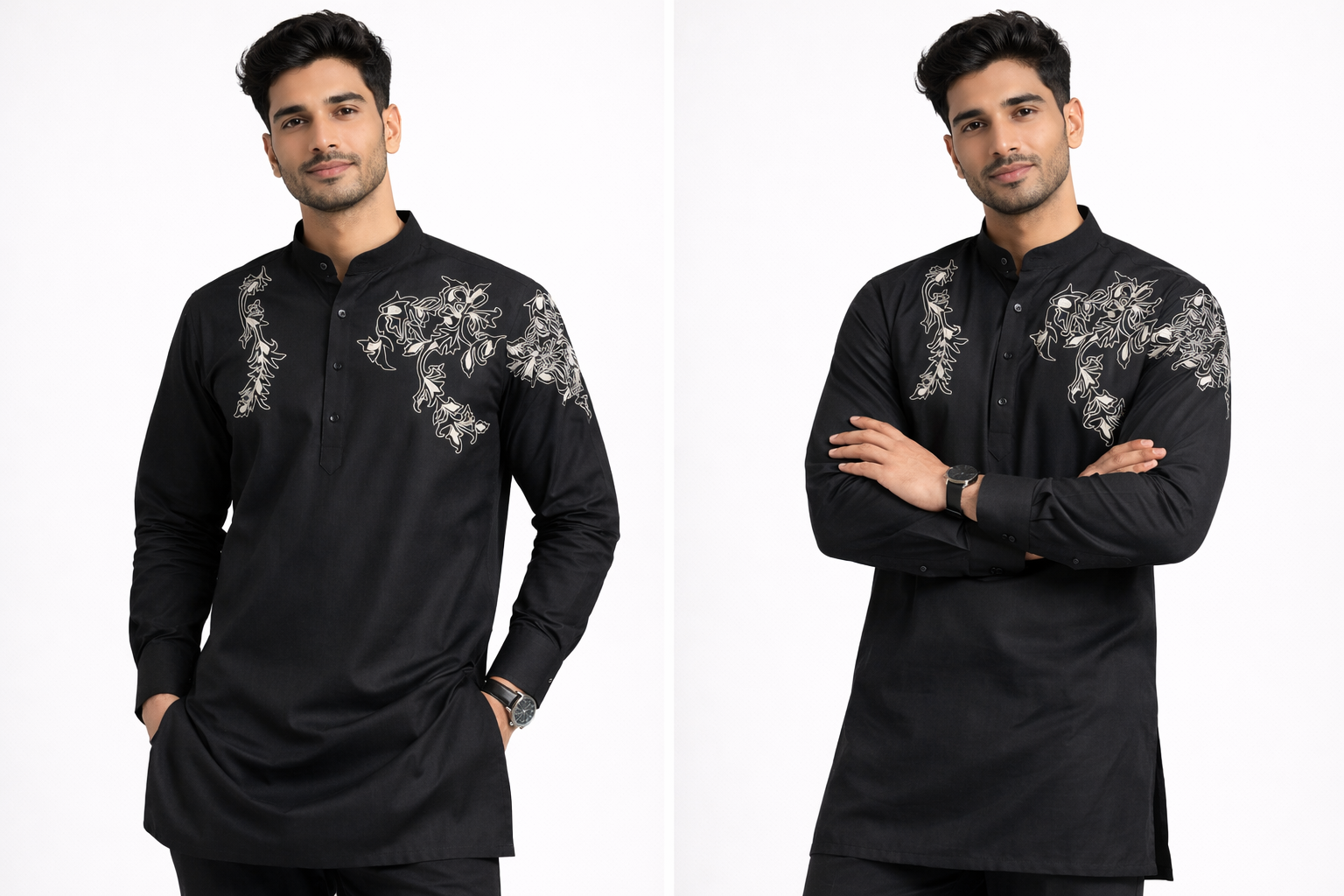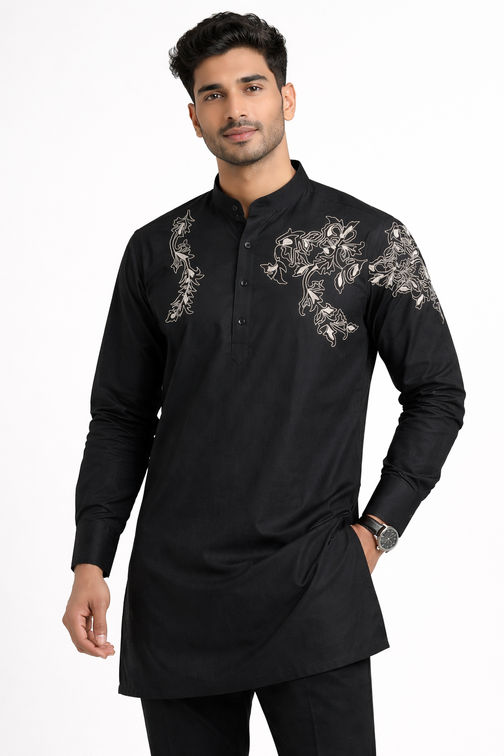A sleek and sophisticated black men’s kurta designed for a refined festive and occasionwear look. Featuring elegant silver floral embroidery across the chest and shoulder, this piece blends classic ethnic styling with a modern premium finish. The clean mandarin collar and tailored silhouette make it perfect for weddings, Eid, family functions, dinners, and special events.