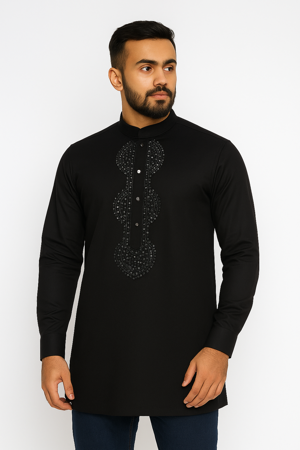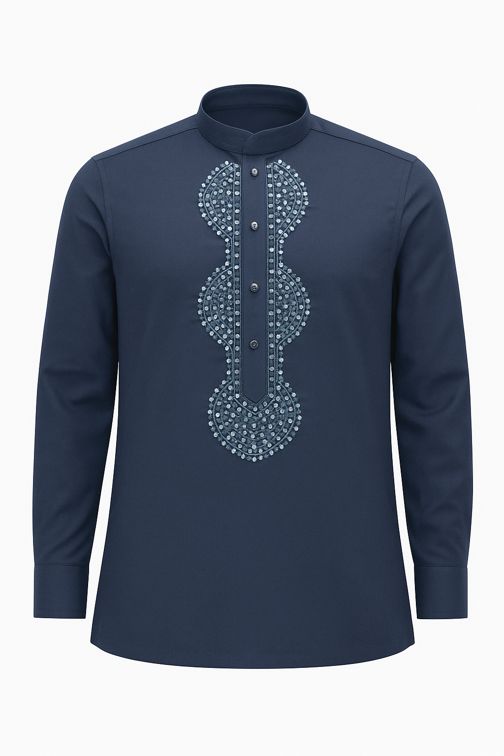 This elegant men’s shirt exudes a refined blend of tradition and modern sophistication. Crafted from premium quality cotton-blend fabric, it features a sleek mandarin collar and full sleeves with buttoned cuffs. The highlight is its intricate black-on-black embroidery design running vertically along the front placket, adding a subtle yet luxurious texture.Perfect for festive occasions, evening gatherings, or formal events, this kurta delivers both comfort and class. Its tailored fit enhances the silhouette while maintaining an effortlessly graceful look.Key Features: