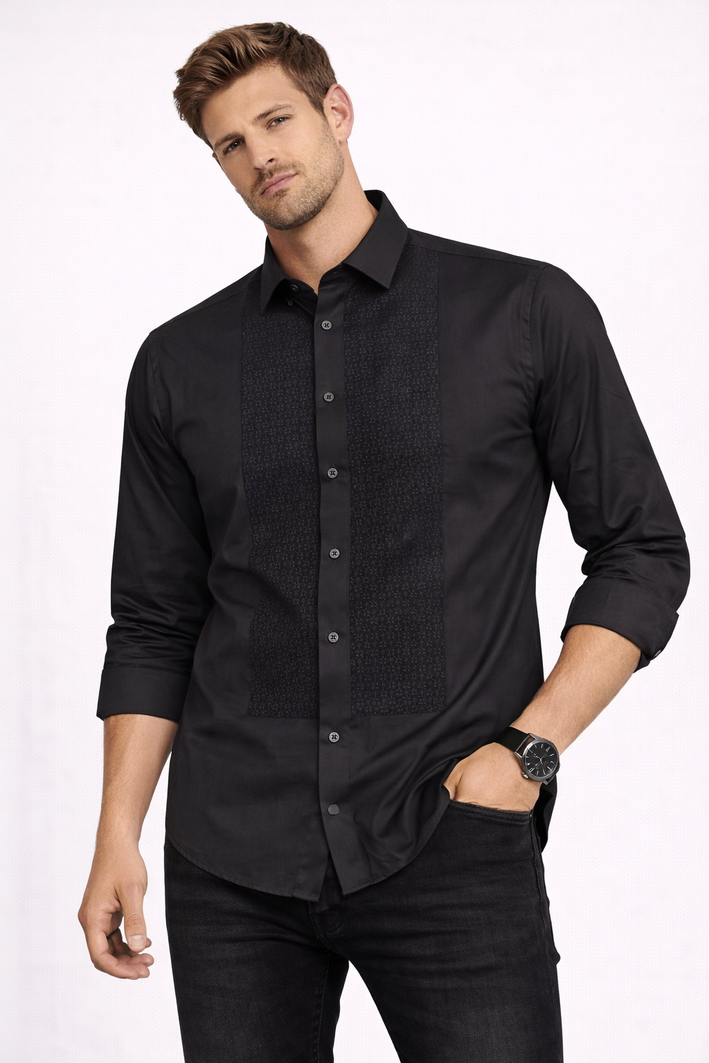 Make a powerful style statement with this black designer shirt featuring an elegant textured front panel. The subtle pattern detailing adds depth and sophistication while maintaining a clean, refined appearance—perfect for men who prefer understated luxury.Tailored in a modern slim fit, this shirt offers a sharp silhouette with all-day comfort. The all-black palette enhances its versatility, making it an essential piece for evening wear, festive occasions, and upscale casual looks.